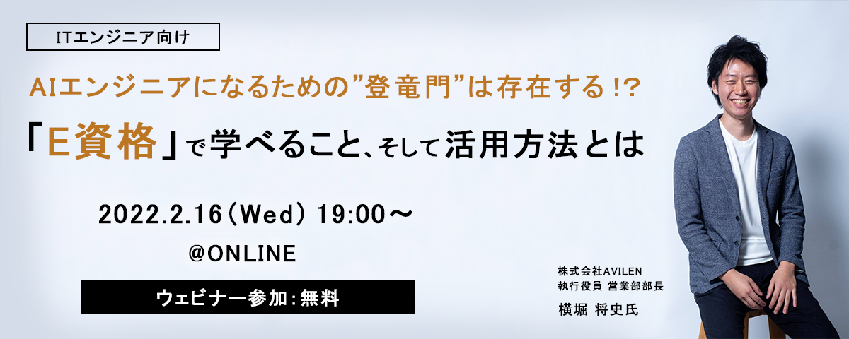 今回、AI・機械学習に関する技術開発と人材教育を行うAVILENで執行役員を務める横堀氏を講師に迎え、AIエンジニアに関するウェビナーを開催致します。AVILENでは、一人でも多くのエンジニアがAI開発の素養を身に着けることで、より多くの人に「AIの価値」を届けることができるようになると考え、AIエンジニアを目指す方々に、登竜門である『E資格』と、その対策講座として合格者数No.1を誇るAVILENの『全人類がわかるE資格コース』を通して支援してきました。