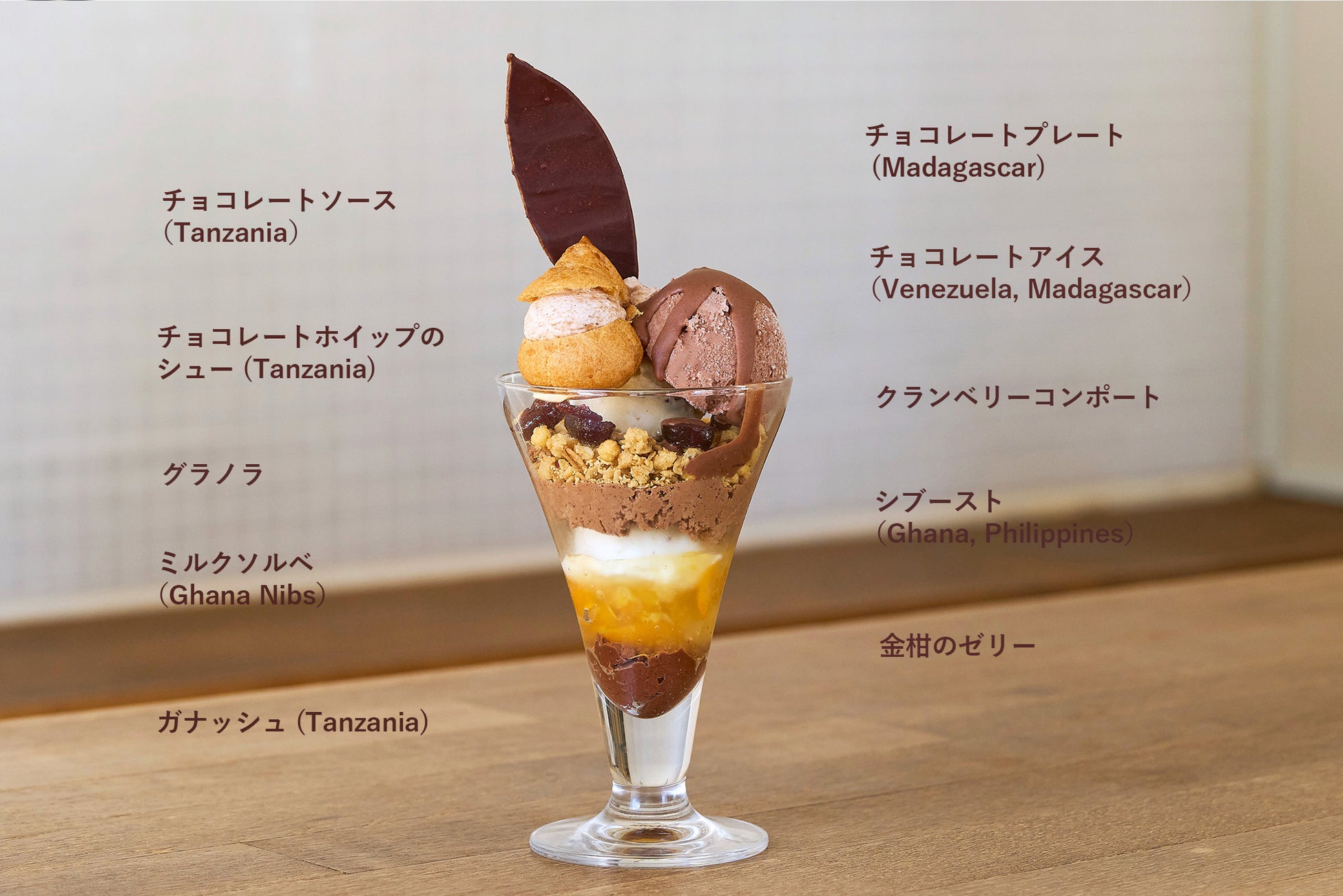 今シーズンは香り豊かな5カ国のチョコレートを使いながら、さっぱりとした金柑と共にお楽しみいただけるパフェをご用意しました。
