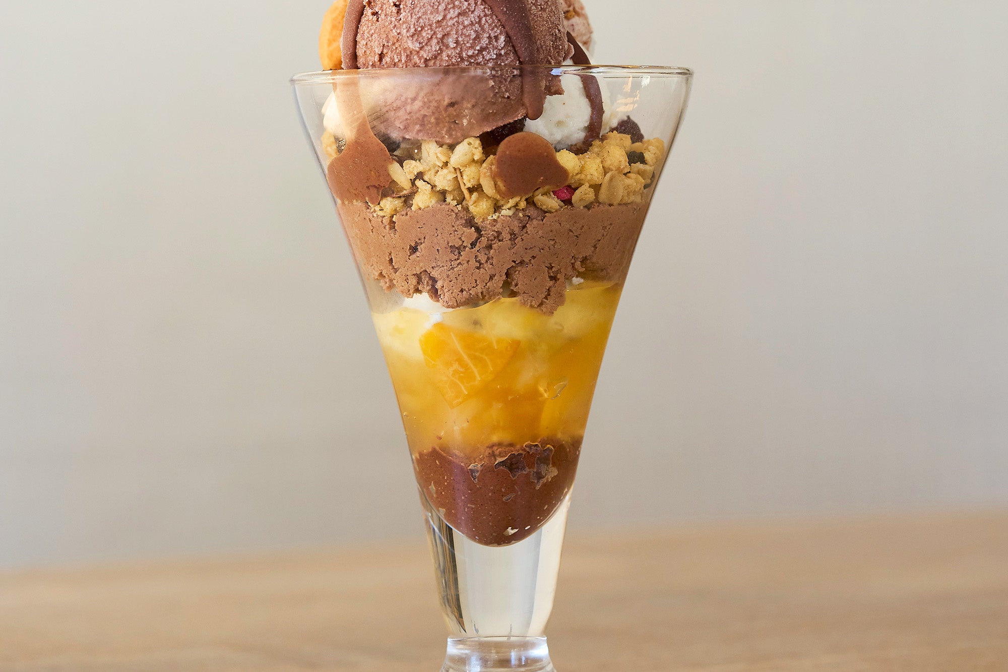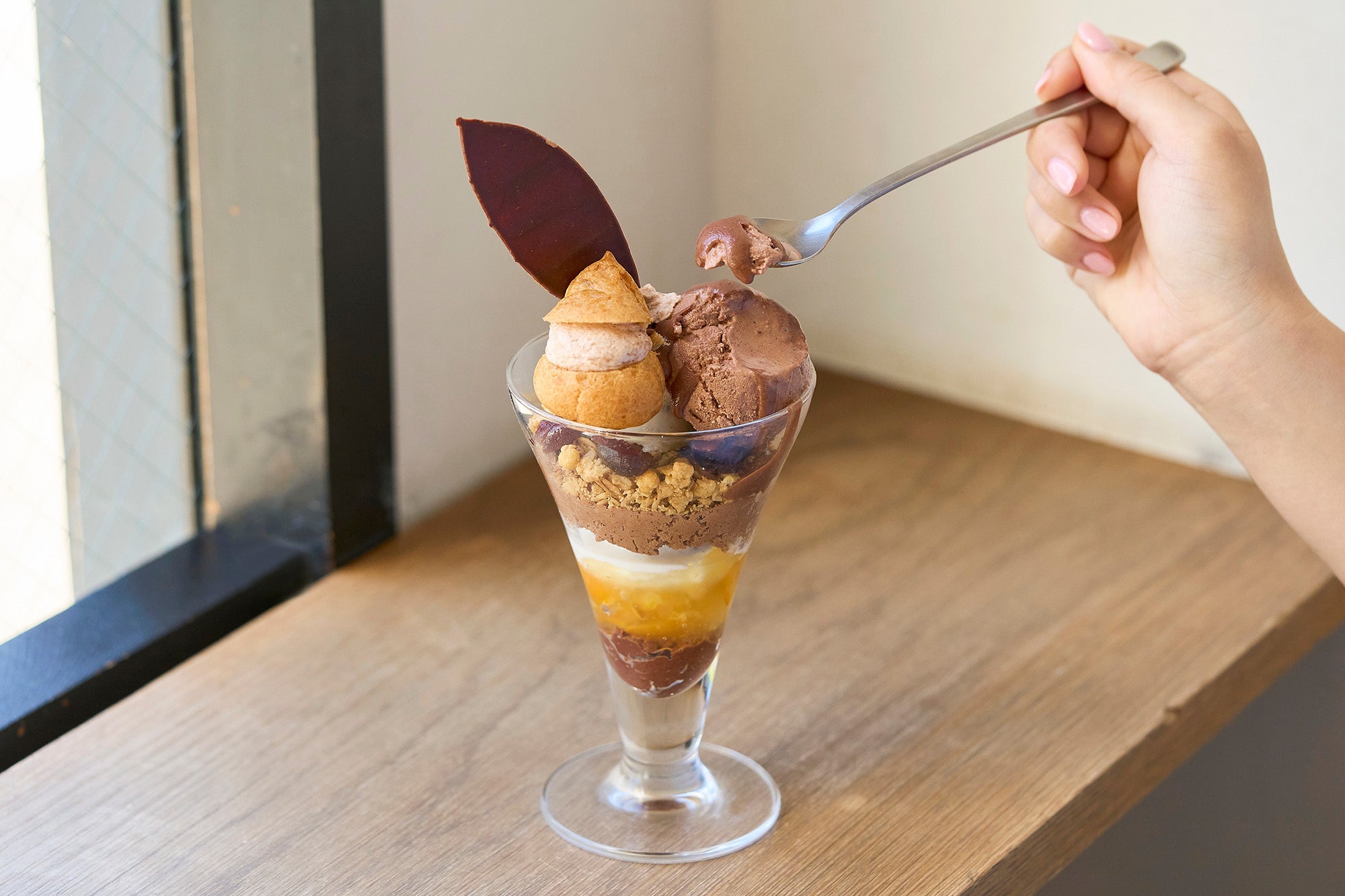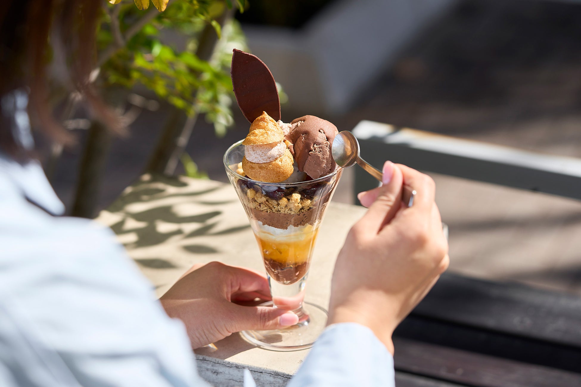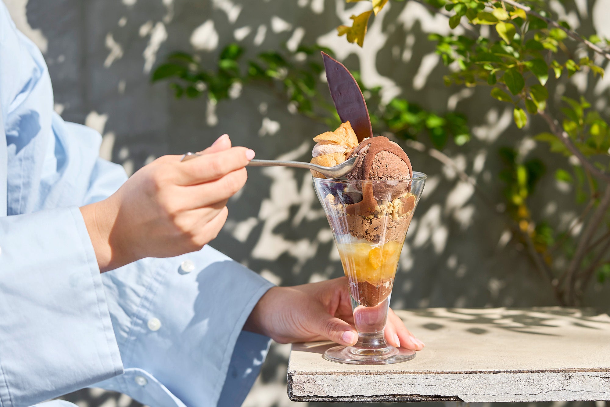 トップのチョコレートアイスには、ベネズエラ産カカオとマダガスカル産カカオをブレンドし、カカオ由来の果実味も感じる軽やかな味わいに仕上げました。