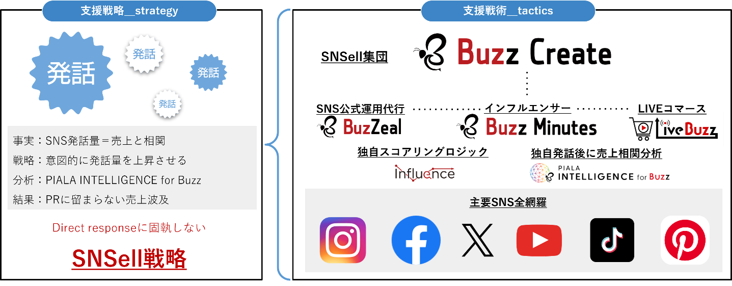 昨今の広告費用の高騰や、広告効率の悪化を受け、より効率的なマーケティング(NoPaid)が必須となっている中、当社はPRや口コミ、ユーザーの発話(発する単語)をバズらせ、売上を増加させる当社独自のマーケティング施策として「SNsellマーケティング」サービスを提供しております。また発話と売上の相関分析が可能となるツール「PIALA INTELLIGENCE for Buzz」を活用することで、認知から共感・理解、購入・ファン化まで全ての領域を担い、クライアントの収益向上に貢献しております。