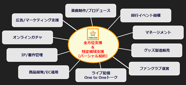 株式会社サイバースターでは、IT技術及び独自システムによるDX支援×プロ人材により、ライブ制作、グッズ制作、ファンクラブ運営など、それぞれのクリエイターが求める事業・サービスに対し、プロスペックの支援を行う「エンタメパーシャル契約」を実践いたします。