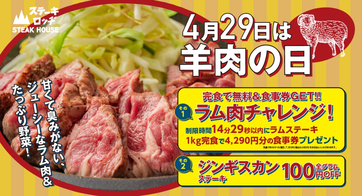 株式会社ファイブグループ(本社:東京都武蔵野市、代表取締役社長:坂本 憲史)の関連会社である株式会社B級グルメ研究所(本社:東京都武蔵野市、代表取締役社長:坂本 憲史)が運営するステーキハウス『ステーキロッヂ 秋葉原店』は、4月29日の羊肉の日を記念して、ラム肉メニューである「ジンギスカンステーキ」を100円割引にて提供いたします。また「ラム肉チャレンジ」メニューも1日限定でご用意。制限時間14分29秒以内にラムステーキ1kgとたっぷりの野菜を完食した方は代金が無料に。さらに次回以降お使いいただける4,290円分のお食事券をプレゼントします。年に1度の羊肉の日、ぜひみなさまのペースでラム肉をお楽しみください。