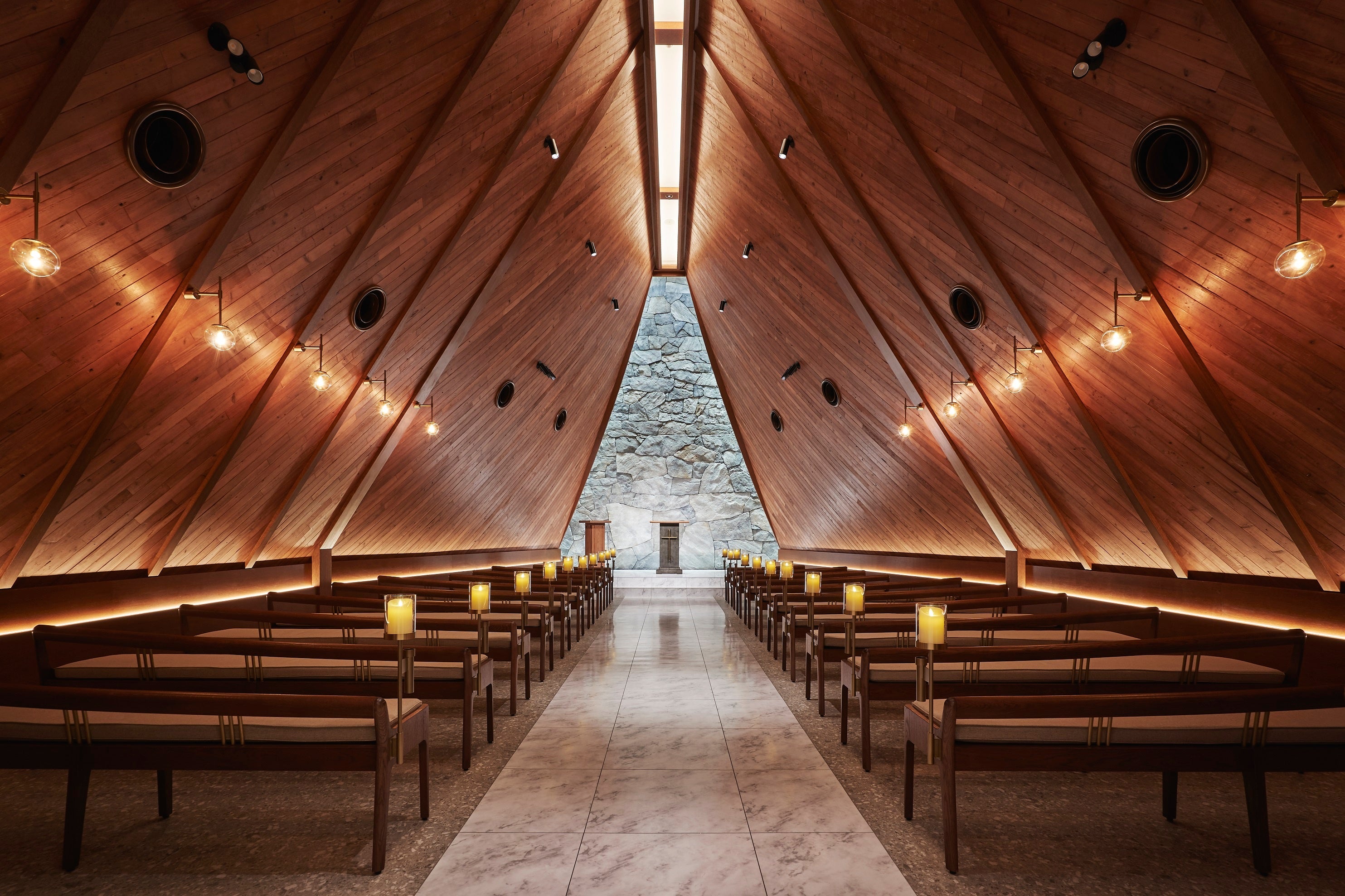 チャペル壁面の素材には建築現場で用いられる“足場板”をリユースした古材を使用。「ウッドデザイン賞2023」では、古材のアップサイクルを通して、長年使用されたことで生まれた木の表情を活かし、新しい木材には出せない温かな質感を持った空間を創出したことが評価に繋がりました。