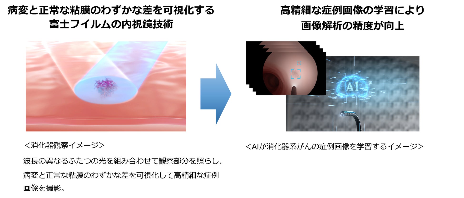 富士フイルムは、消化器系がんの症例画像を集めて、その膨大な画像データを、ディープラーニングを活用してAIに学習させ、内視鏡AI診断支援技術を開発しました。これまで培ってきた光源制御技術や画像処理技術を使って撮影された高精細な症例画像を学習データに用いることで、AIの学習を効率的に行い、画像解析の精度向上につなげました。