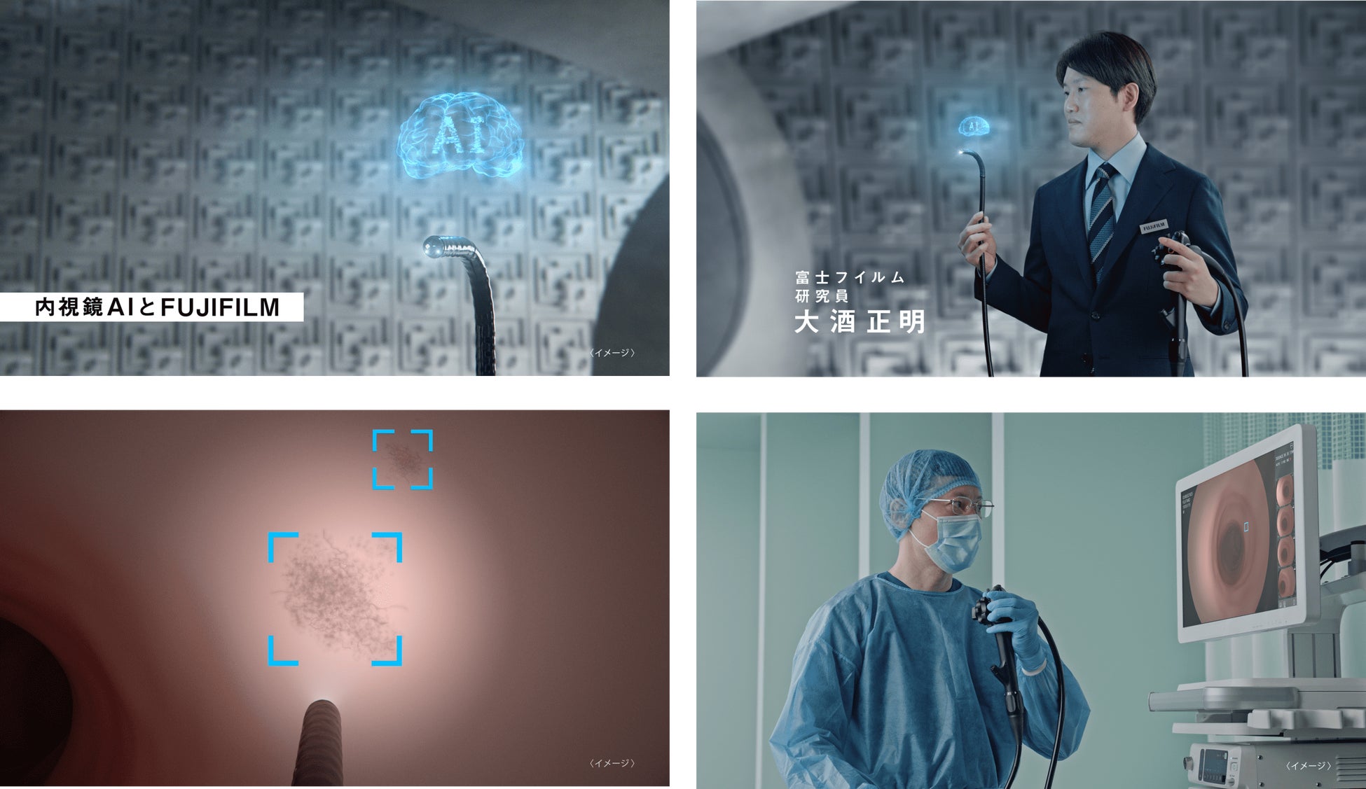 新TVCMでは、富士フイルムが開発した内視鏡AI診断支援技術(※1)を紹介します。本技術は、胃・食道・大腸の内視鏡検査中にリアルタイムに画像解析を行い、がんが疑われる領域を検出して、医師の内視鏡検査をサポートするAI技術です。