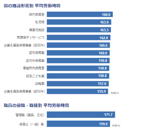 施設形態別の平均労働時間については、全体平均の160時間とそこまで大きな差がない。一方で、院内保育室や乳児院、障害児施設などの一部24時間の勤務体制を行っている施設では、平均よりもやや勤務時間は長くなっている。また、役職別の平均労働時間については、管理職の勤務時間が一般(管理職以外)より長くなっている。