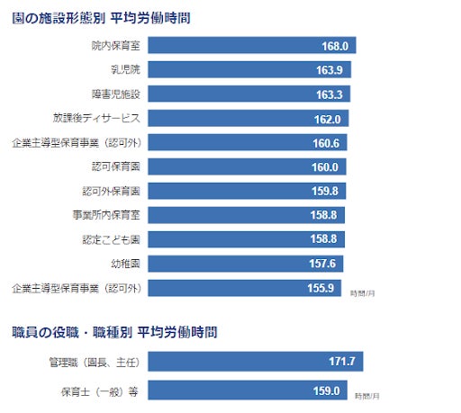 厚生労働省による「令和2年賃金構造基本統計調査 」の「一般_都道府県別_職種(特掲)DB 」によると、保育士の所定内実労働時間は168時間であり、弊社が出したデータよりやや長くなっている。その理由として、今回集計対象となっている園では、ICTシステムを導入している園であることが要因になっている可能性がある。