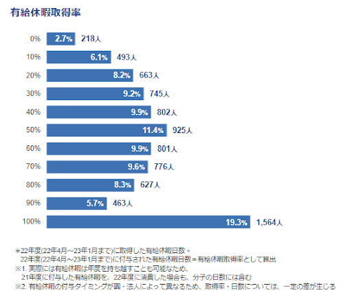 平均の有給消化率は66.8%となった。取得率別の人数構成比では、100%取得している方が最も多く、次いで50%、40%となった。