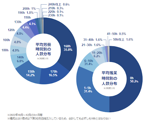 平均労働時間別の人数分布では、月160時間が全体の35.8%となっており、次いで170時間、150時間となっている。なかには200時間を超える職員も存在している。