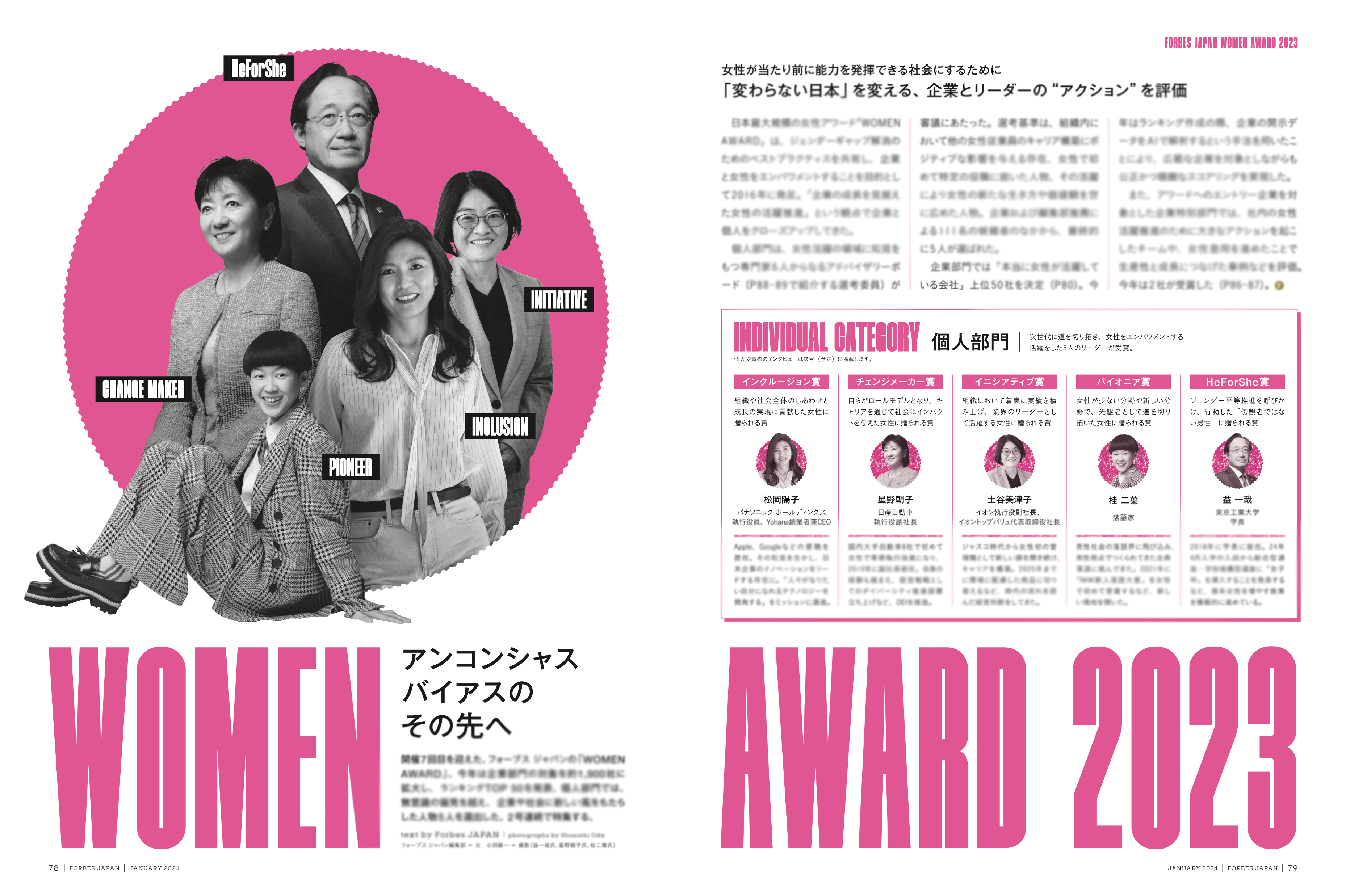 恒例の「WOMEN AWARD」を今年も開催。今、日本で最も女性活躍を推進する意欲と実績のある企業はどこか? 「ダイバーシティ」「労働環境」「人的資本開発」「パフォーマンス」の4カテゴリを軸に1,905社を調査し、「本当に女性が活躍している会社」TOP50を発表。総合1位となった資生堂、特別賞を受賞したコカ・コーラ ボトラーズジャパンなど、無意識の偏見を超え、社内外に新しい風をもたらした企業の取り組みを紹介する。