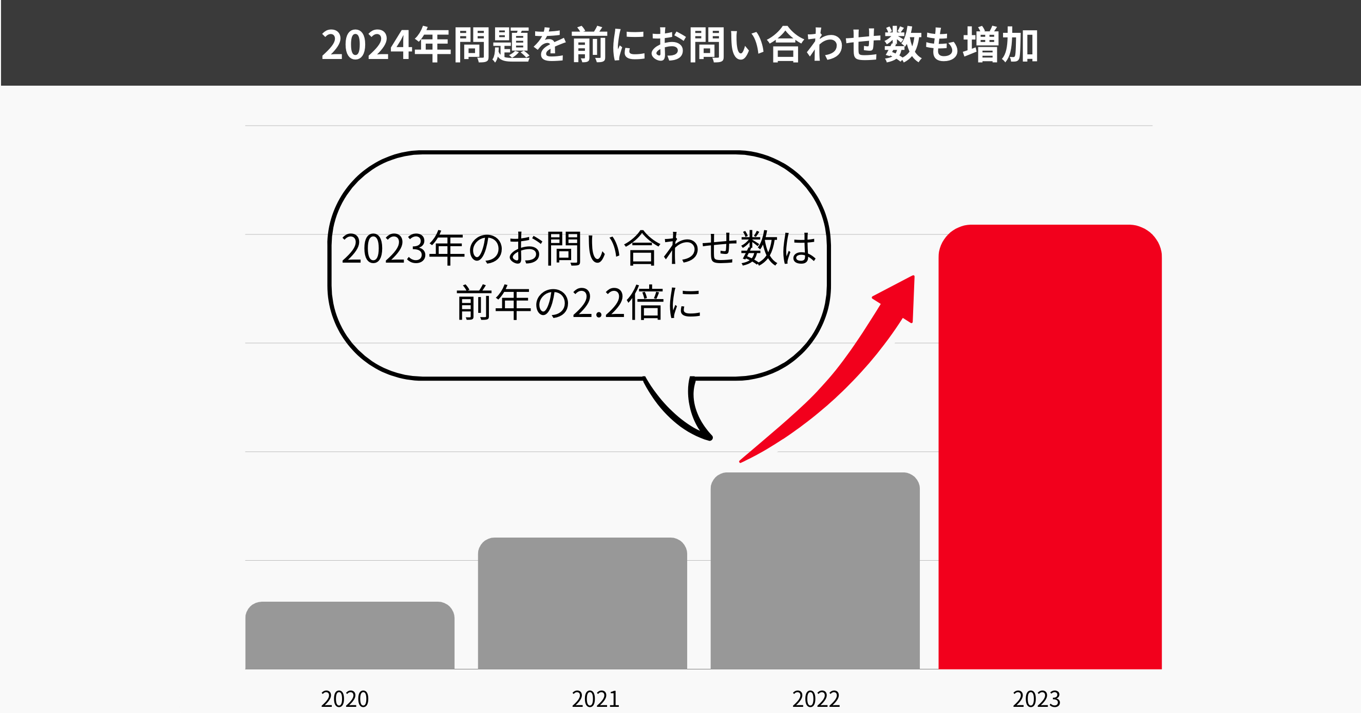 こうした社会の動きにより、物流を「自社の問題」として捉える荷主企業が増えてきました。物流効率化の手段となるMOVO Berthを検討いただき、結果として導入につながるケースも出てきています。Hacobuでも、2023年のお問い合わせ数は前年の2.2倍(※4)となっています。