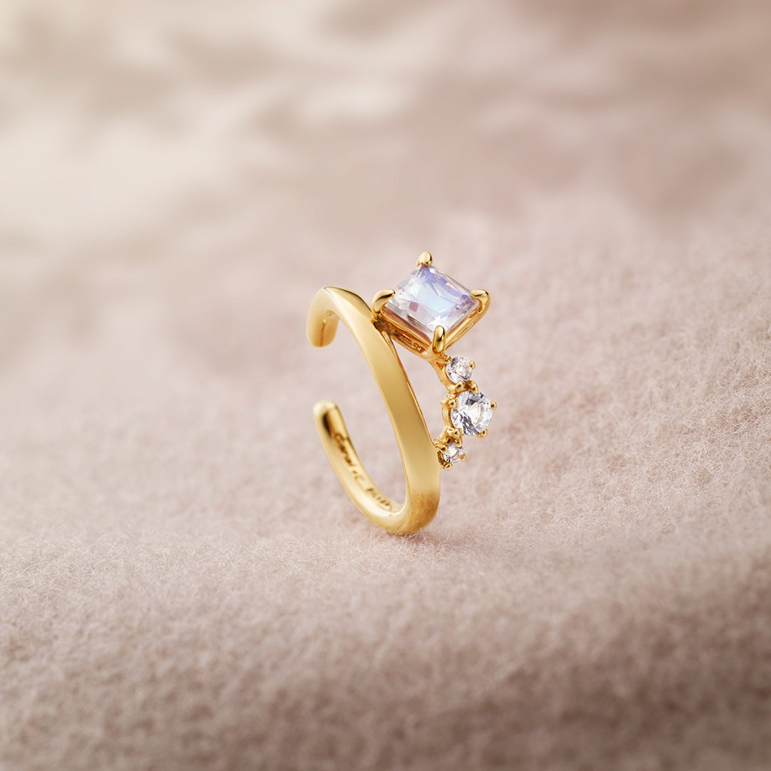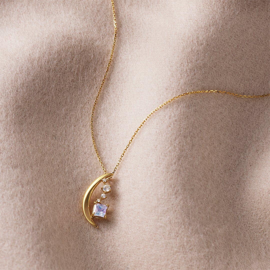 夕暮れ前の明るい空に浮かぶ白い月の儚い美しさをプリンセスカットのフェルスパーで表現したシリーズ。見る角度によってさまざまに表情を変えるフェルスパーは、うっとりと見とれてしまうような美しさです。眩い月の煌めきを象徴するようにダイヤマークにアレンジしたフェルスパーの光穴は「Canal 4℃」ならではのこだわり。
