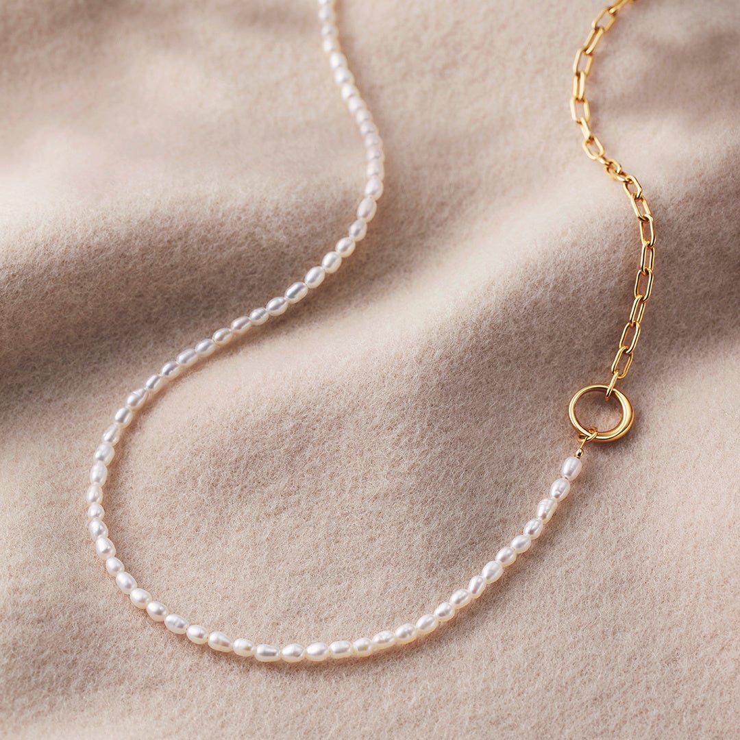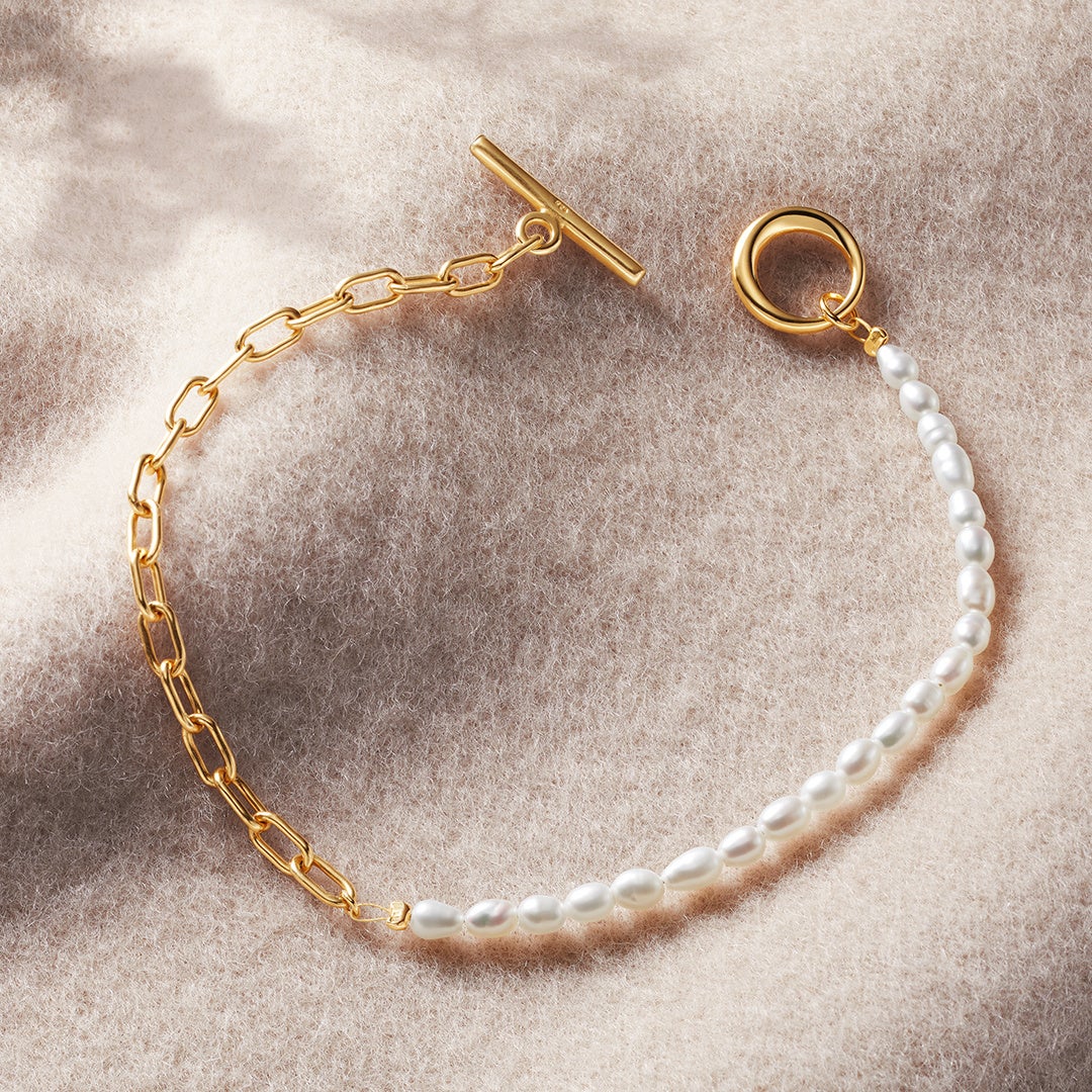 秋の月を連想させるパーツに、多様な形を持つケシパールを合わせたクラシカルかつモダンなシリーズ。引き込まれるホワイトのパールとゴールドカラーの月モチーフのコントラストが、上品ながらもデイリーユースしやすいデザインです。トレンドのパールも相まって旬な表情を魅せるブレスレットは、留め具がカジュアルなマンテル仕様で身に着けやすく、ほどよい存在感でヘルシーな手元を演出。