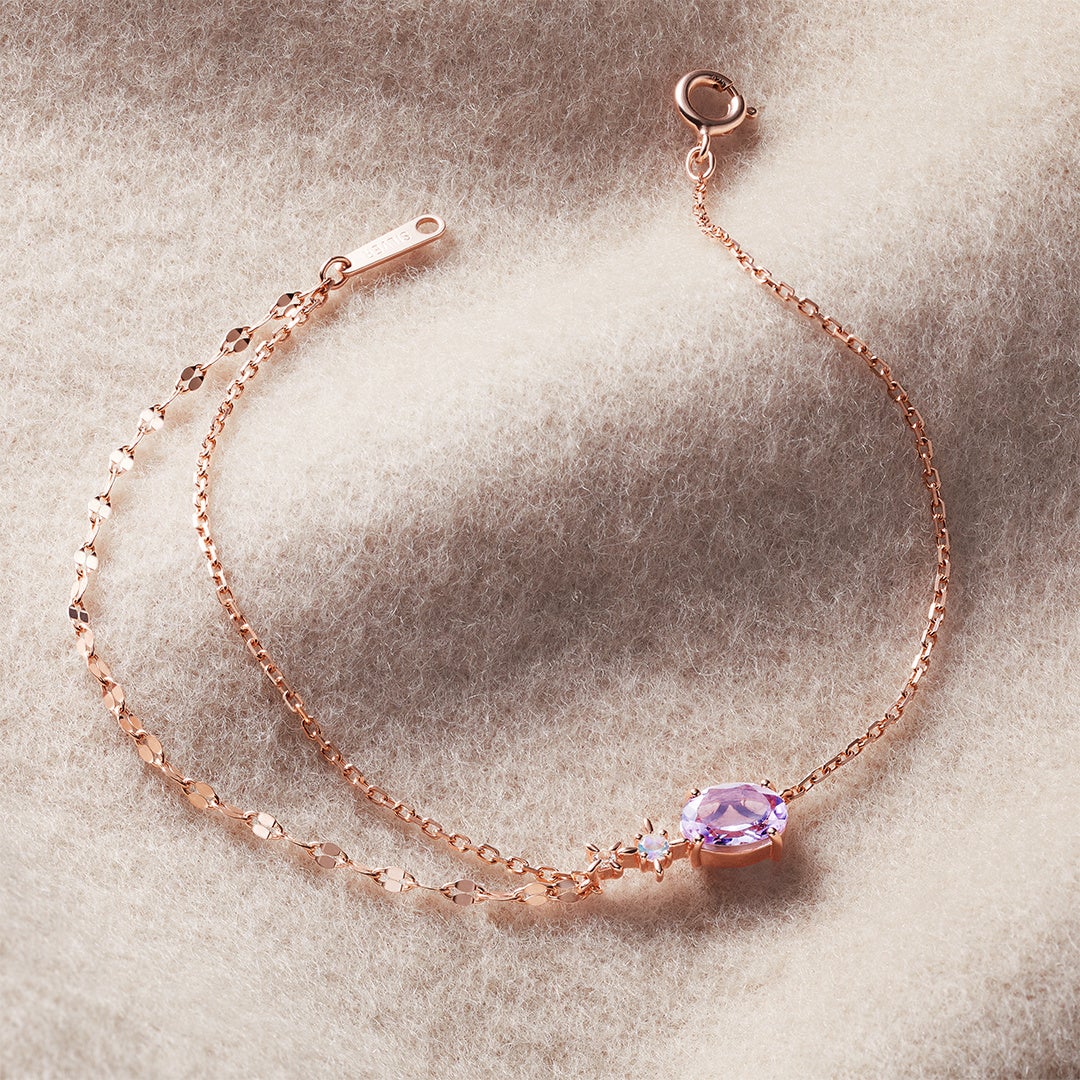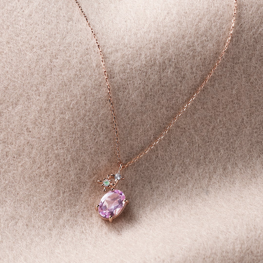 1本でもセットでも、その日のコーディネートをより華やかに演出するセットネックレスには、「真実の愛・心の平和」の意味を持つピンクアメシスト、「浄化・美」の意味を持つフェルスパーをセレクト。
