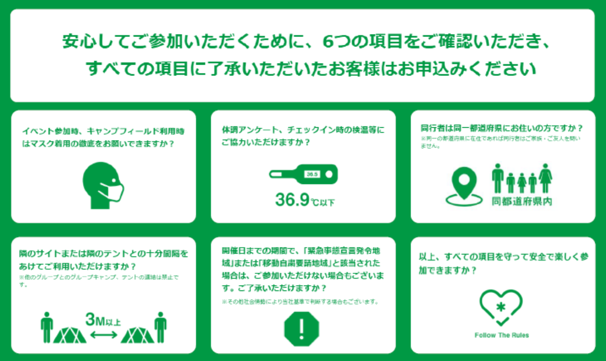 感染予防対策といたしまして、マスクの着用、入場時の体温測定、サイトの間隔は3m確保を徹底して実施いたしますので、ご参加の皆さまはご協力をお願いいたします。