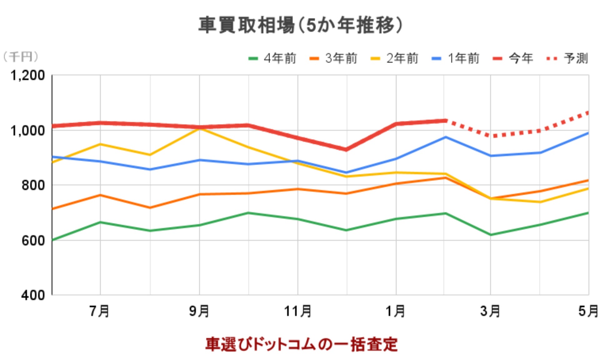 車選びドットコムの予測では、今後、新生活需要の落ち着く3月を底に回復したあとは、夏に向けて上昇傾向が続くと見込まれます。