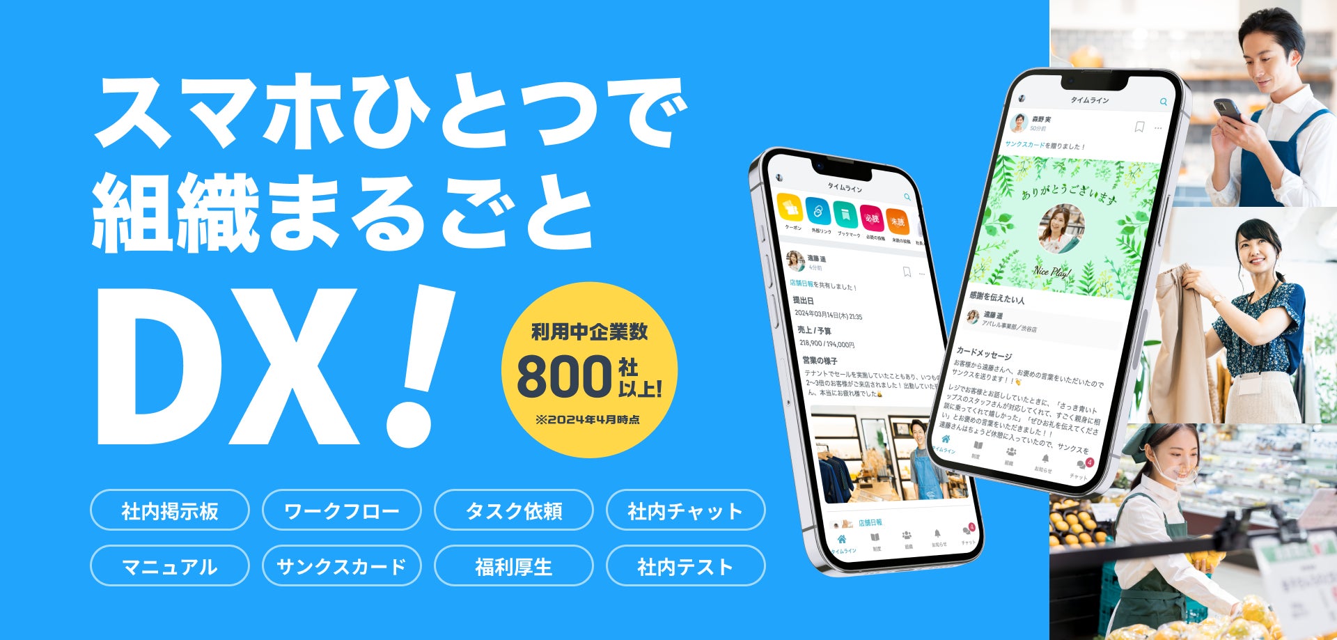 社内掲示板/ワークフロー/タスク依頼/社内チャット/マニュアル/福利厚生/社内カレンダー/社内テスト/サンクスカード/社内ポイント/日報/社内アンケート etc…