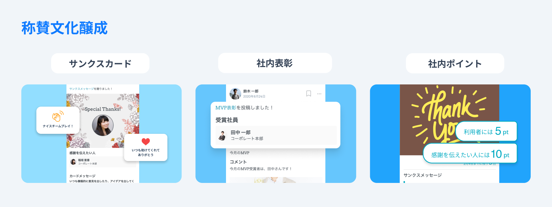 従業員のチャレンジや日々の努力、成果、会社への貢献を取り上げ表彰できます。会社として称賛される成果や行動を行った方を表彰することで、推奨される行動を明確化します。