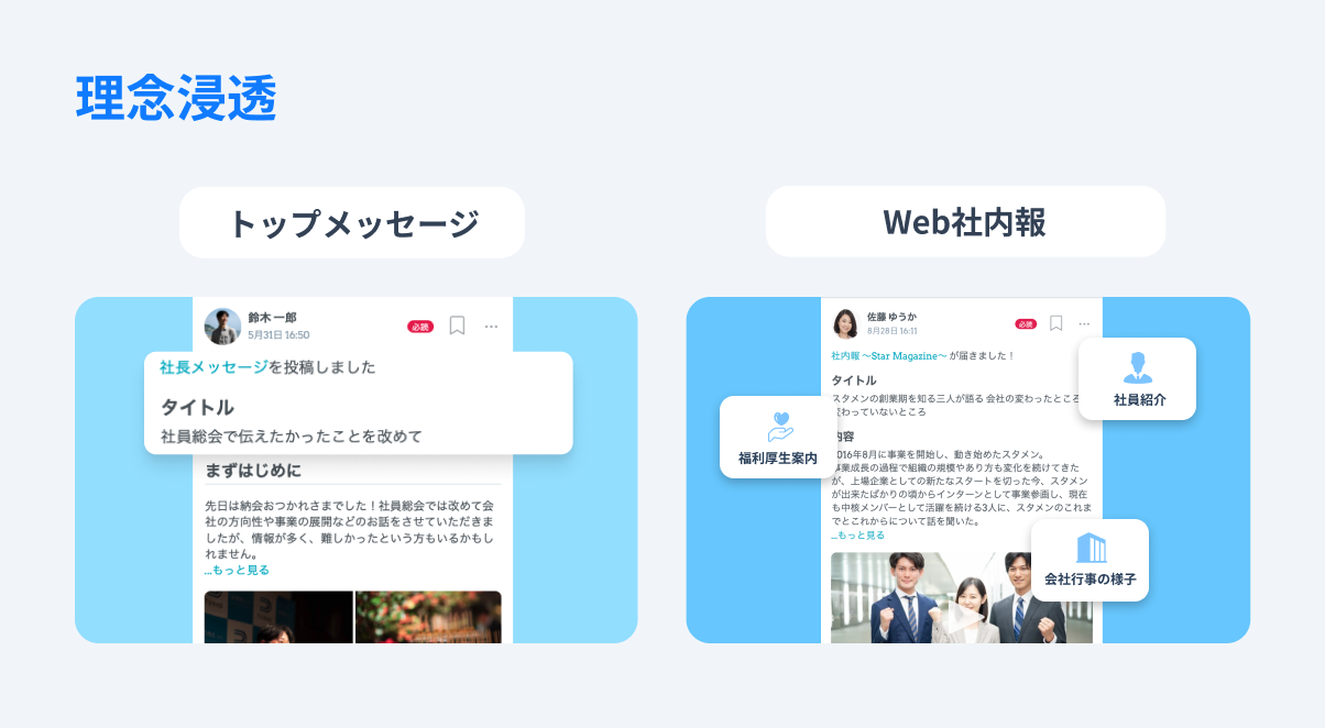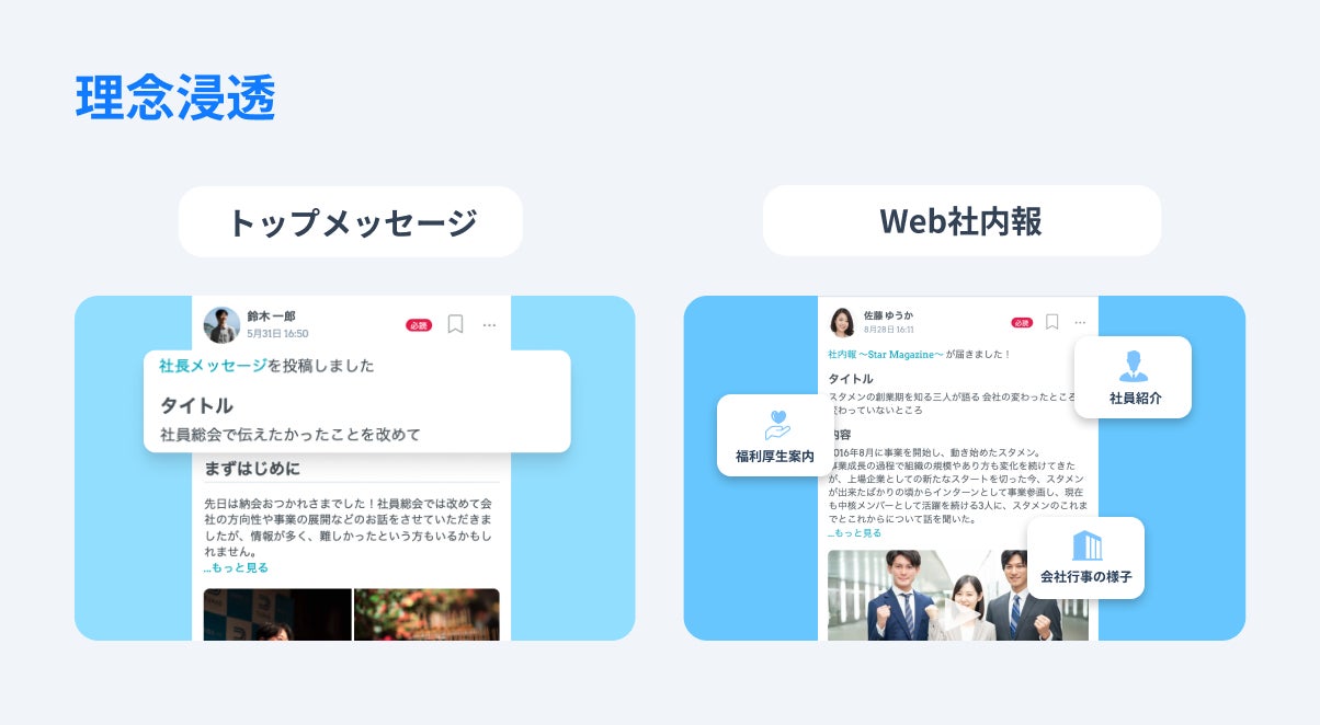 経営層の関心や事業の方向性、トップの考え・価値観などの情報をタイムリーかつダイレクトに共有できます。動画や画像などのデータを添付が可能です。
