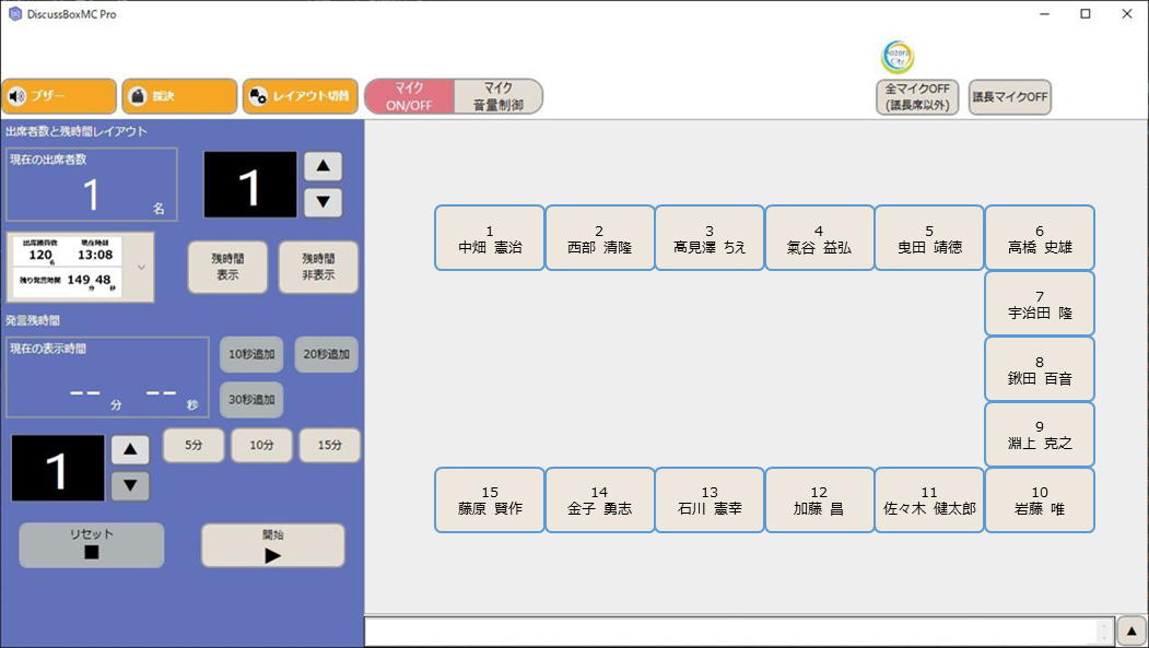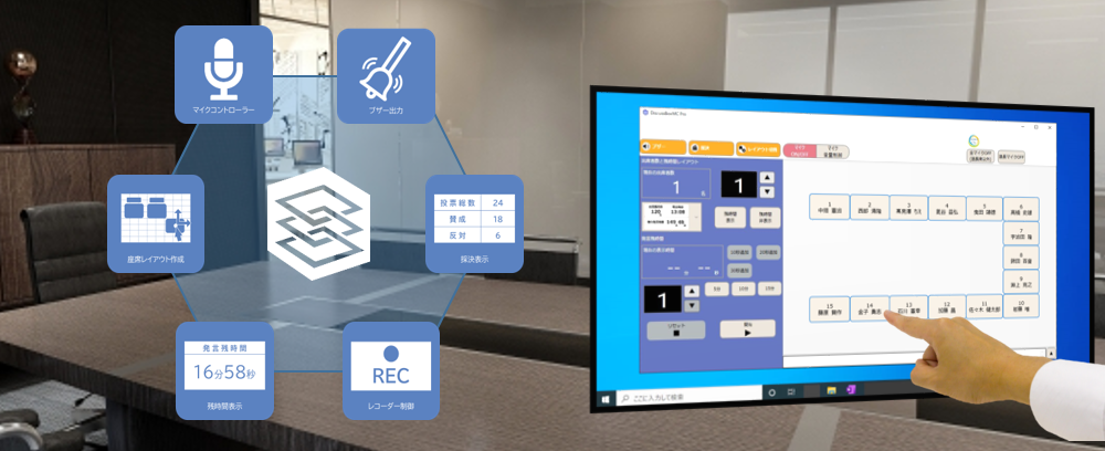 今回ラインナップに追加する「DiscussBoxMC」、「DiscussBoxMCPro」は、マイクの制御に特化し、議事進行が必要な会議等で各席に設置したマイクやラック内のレコーダーなどを、お手元のPC画面上の座席を選択するだけで直感的に操作できる制御ソフトウエアです。自治体の本会議場・委員会室をはじめ、議事進行が必要な一般の会議室向けにご利用いただけます。