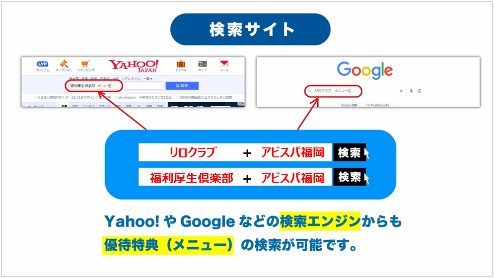 「リロクラブ+アビスパ福岡」または、「福利厚生倶楽部+アビスパ福岡」で検索すると、詳細がご覧いただけます