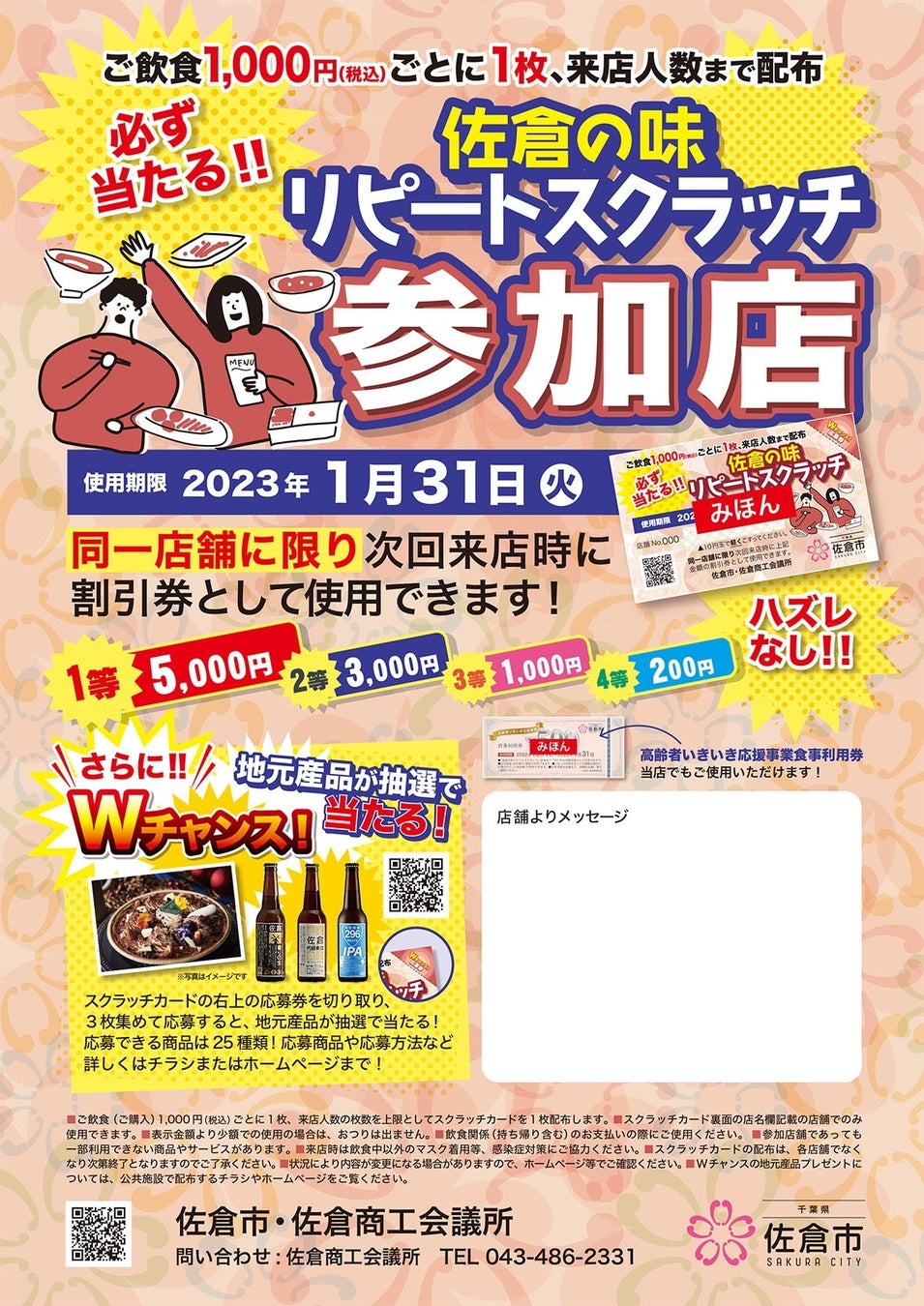 千葉県佐倉市内の参加店舗での飲食(買い物)税込1,000円ごとに1枚、来店人数分の枚数を上限としてスクラッチカードがもらえるキャンペーンを10月1日(土)から開催します。スクラッチカードはハズレなし! 1等5,000円から、4等200円までのいずれかが必ず当たります。カードは割引券として、同じ店舗で次回来店時に使えます。