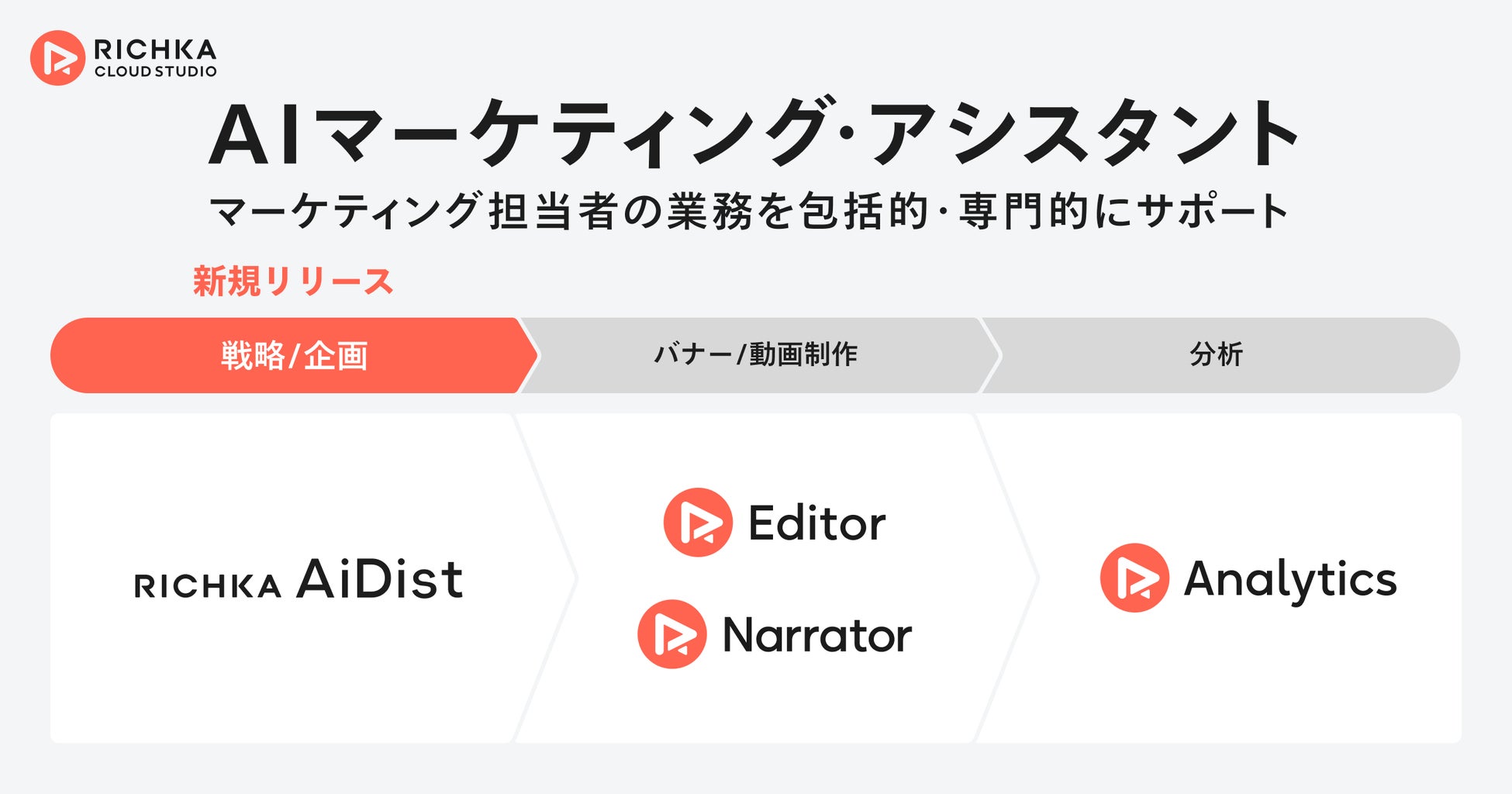 そして、この度、クリエイティブ制作の前段階となる戦略・企画部分を担う「RICHKA AiDist」を正式にリリースしました。これらのプロダクトは『あなたの会社専属のAIマーケティング・アシスタント』をコンセプトとし、今後もマーケティング担当者の業務を部分的ではなく包括的かつ専門的にサポートして参ります。