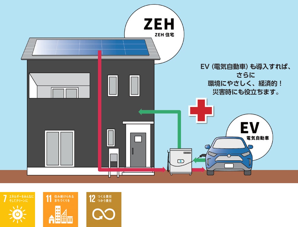 ライフデザイン・カバヤのZEH仕様の住宅を購入する際にEV(電気自動車)も同時購入することにより、環境にやさしく経済的で災害時にも役立つ電気エネルギーマネージメントが行える住宅となります。