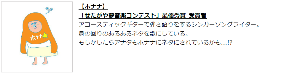また、会場に設けられたステージでは「世田谷ドリームプロジェクト」のミュージックコンテスト「せたがや夢音楽コンテスト」にて最優秀賞を受賞した『ホナナ』さんによる15分間のライブパフォーマンスがあり、エフエム世田谷のラジオ番組「世田谷ドリームプロジェクト」のテーマ曲として起用している「決意の唄。」を披露していただきます。