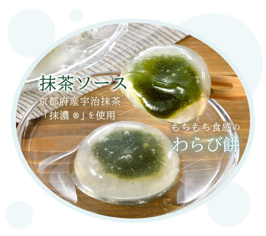 京都府産宇治抹茶「抹濃®」を使用した、とろ~り濃厚な味わいの抹茶ソースを、もちもちとしたわらび餅で包みました。