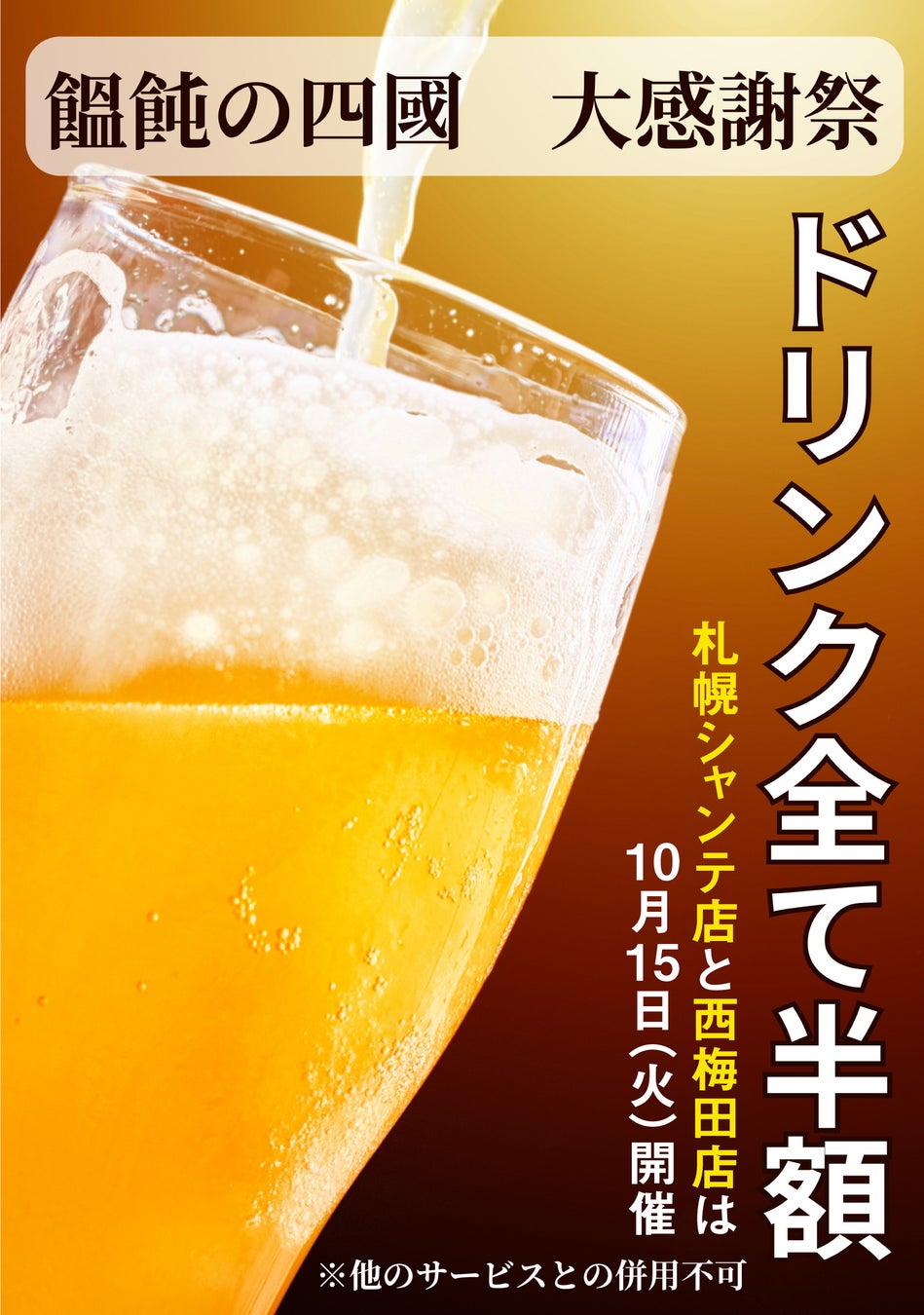 10月15日(火)大感謝祭を開催!うどん居酒屋「饂飩の四國」札幌シャンテ店&西梅田店 ドリンクメニュー全て半額!