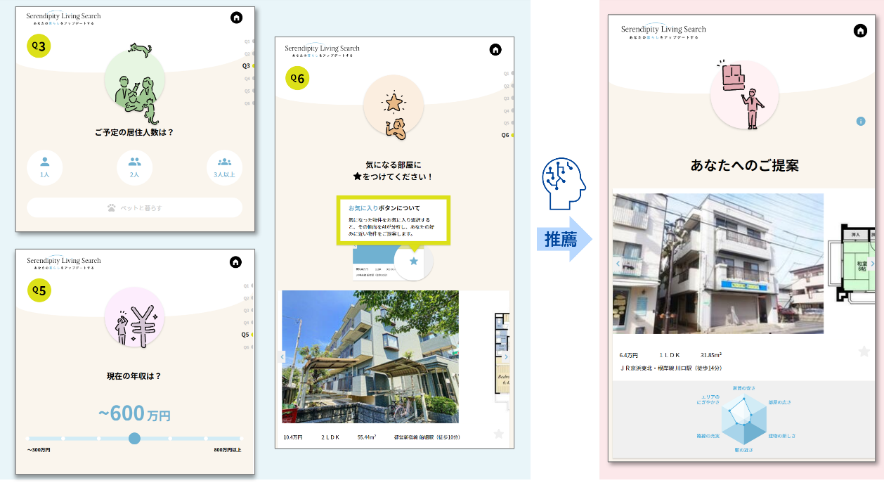 本サービスは、従来のユーザーが指定した条件を元に物件を提案する方法ではなく、ユーザーと属性が近い集団の嗜好パターンをAIが分析し、多種多様な物件の中から潜在的ニーズに合致する可能性のある候補を選別・提案できるセレンディピィをテーマに開発したお部屋探しサービスです。