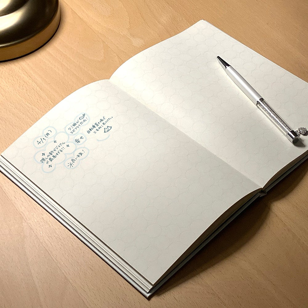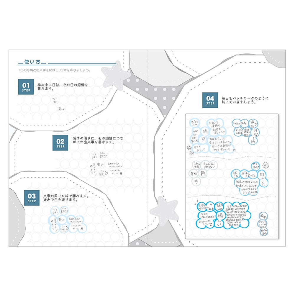 パッチワーク日記の日記ページにはポルカドット(水玉模様)状の小さな丸い枠が並んでいます。この丸い枠は、感情の断片をパッチワークのピースのように繋いでいくためのものです。感情を細かく分けて記入したり、大きく一言で表現したりと、感情の大きさや強さを自由に記録できるのが特長です。後から読み返した時にその時の感情や出来事が丸を繋いだ大きさで読み返す事ができるのが楽しく、新しい形式の日記の魅力となっています。
