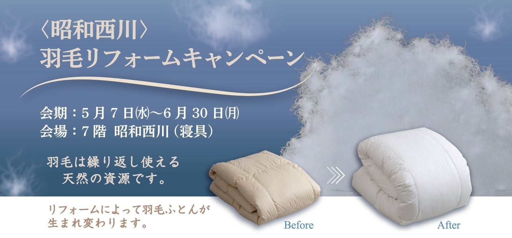 【昭和西川】阪神百貨店7階にて、「羽毛リフォームキャンペーン」を開催いたします!5月7日(水)~6月30日(月)まで