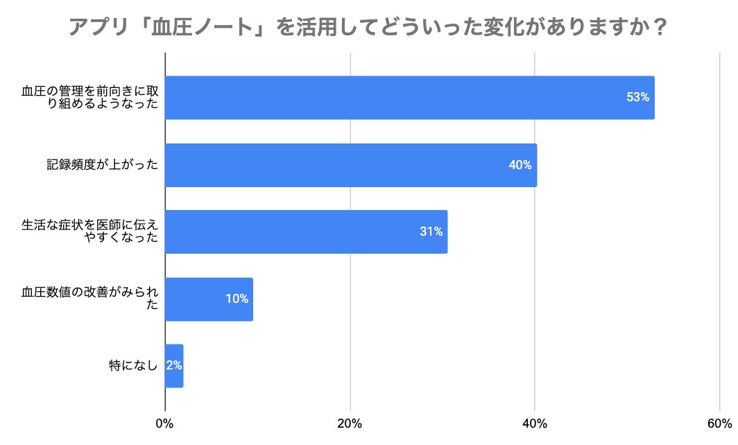 アプリ利用者の5割が「健康管理に前向きになった(52.9%)」と回答し、4割が「記録頻度が上がった(40.2%)」と回答しました。血圧管理にアプリを活用することは、利便性と継続力向上に期待できるほか、モチベーション向上にも影響があることが伺えました。