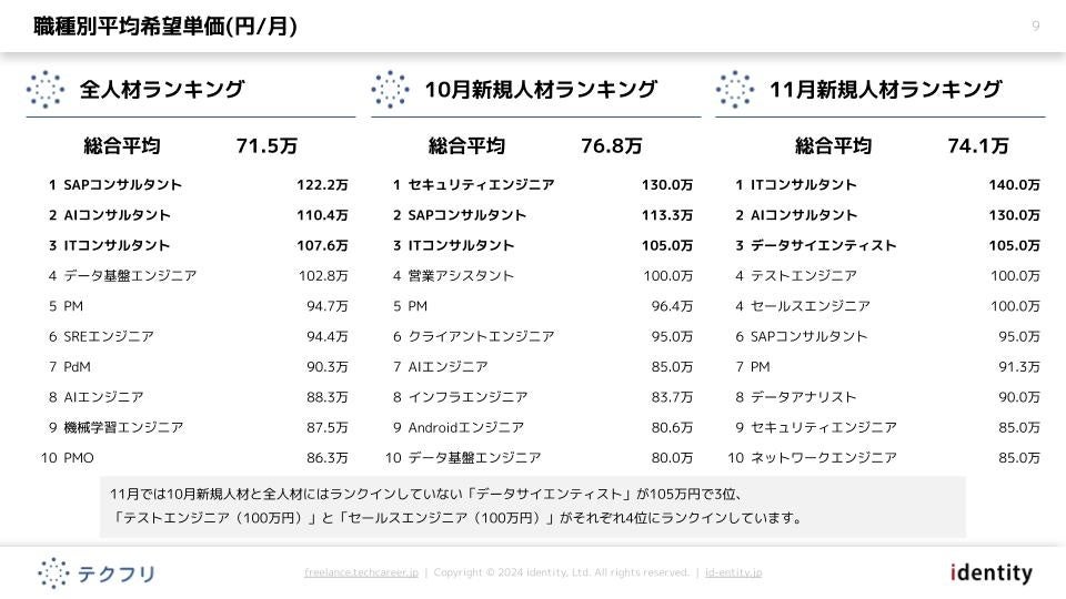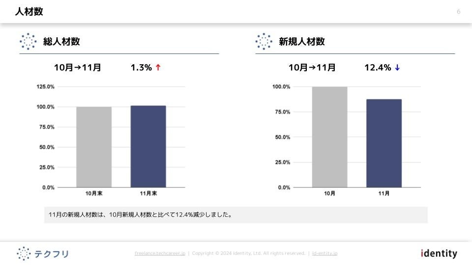 ITフリーランスエンジニアの案件・求人サイト「テクフリ」(https://freelance.techcareer.jp/)を運営する株式会社アイデンティティー(東京都港区、代表取締役:今野 力、以下「当社」)は、テクフリのデータベースをもとに2025年11月における人材の市況感を調査しました。より詳しい結果については、お問い合わせから資料請求が可能です。