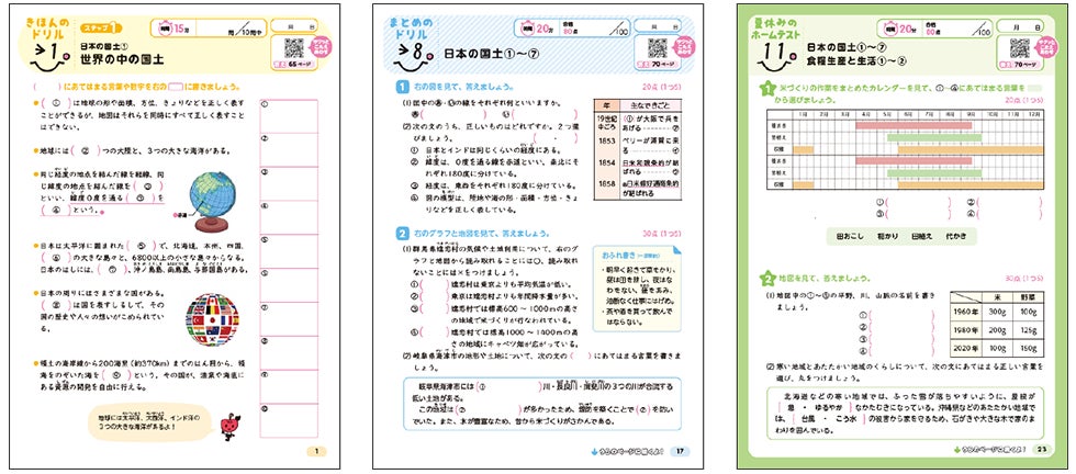 〇夏休み、冬休み、春休みに復習できる「ホームテスト」、学習の進捗を確認できる「がんばり表」つき!低学年は「わくわくシール」を貼ることでモチベーションアップにつながります。