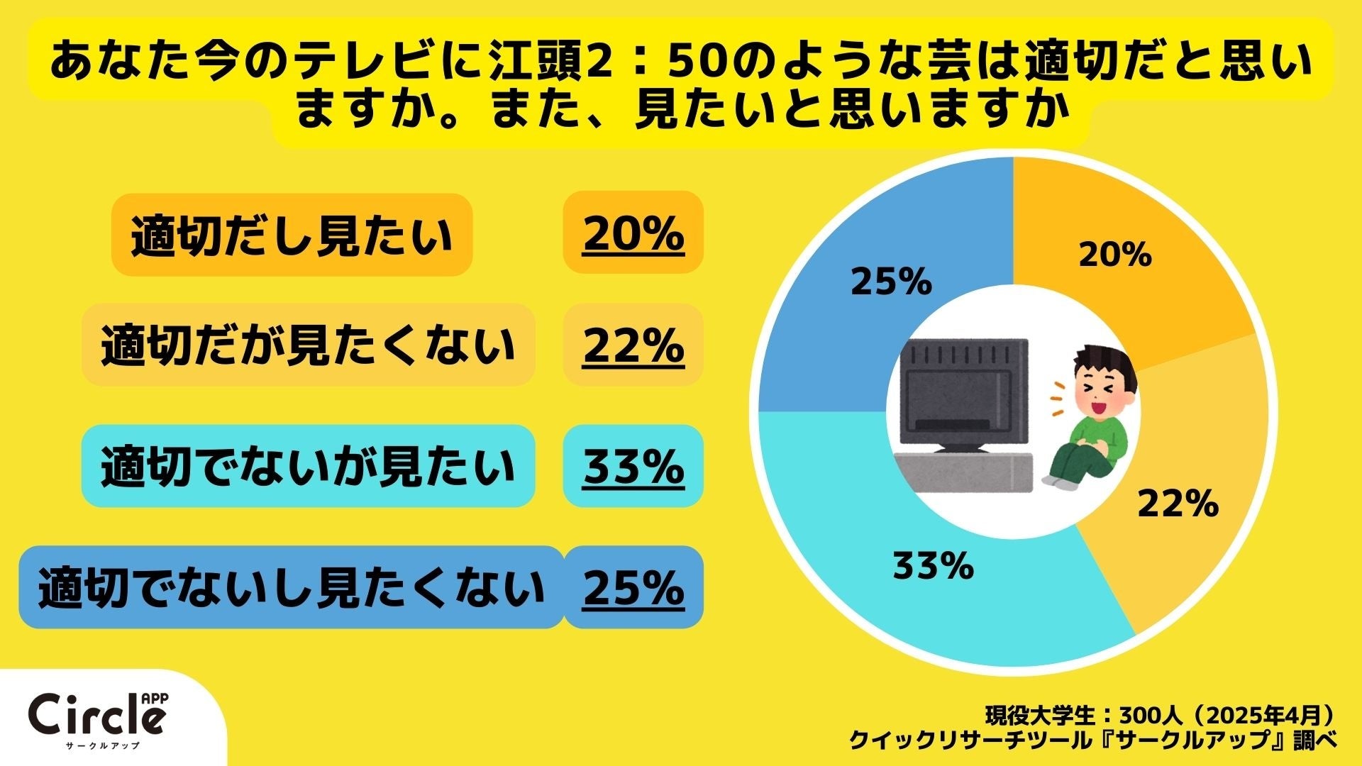 今のテレビに江頭2:50の芸が適切かという質問をしたところ、「適切でない」と回答した学生が過半数を超えた一方で、「また見たい」と回答した学生もまた過半数を超えました。これは、江頭2:50の芸風が現代のテレビ基準にそぐわないとしながらも、視聴者の間には根強い人気が存在することを示しています。