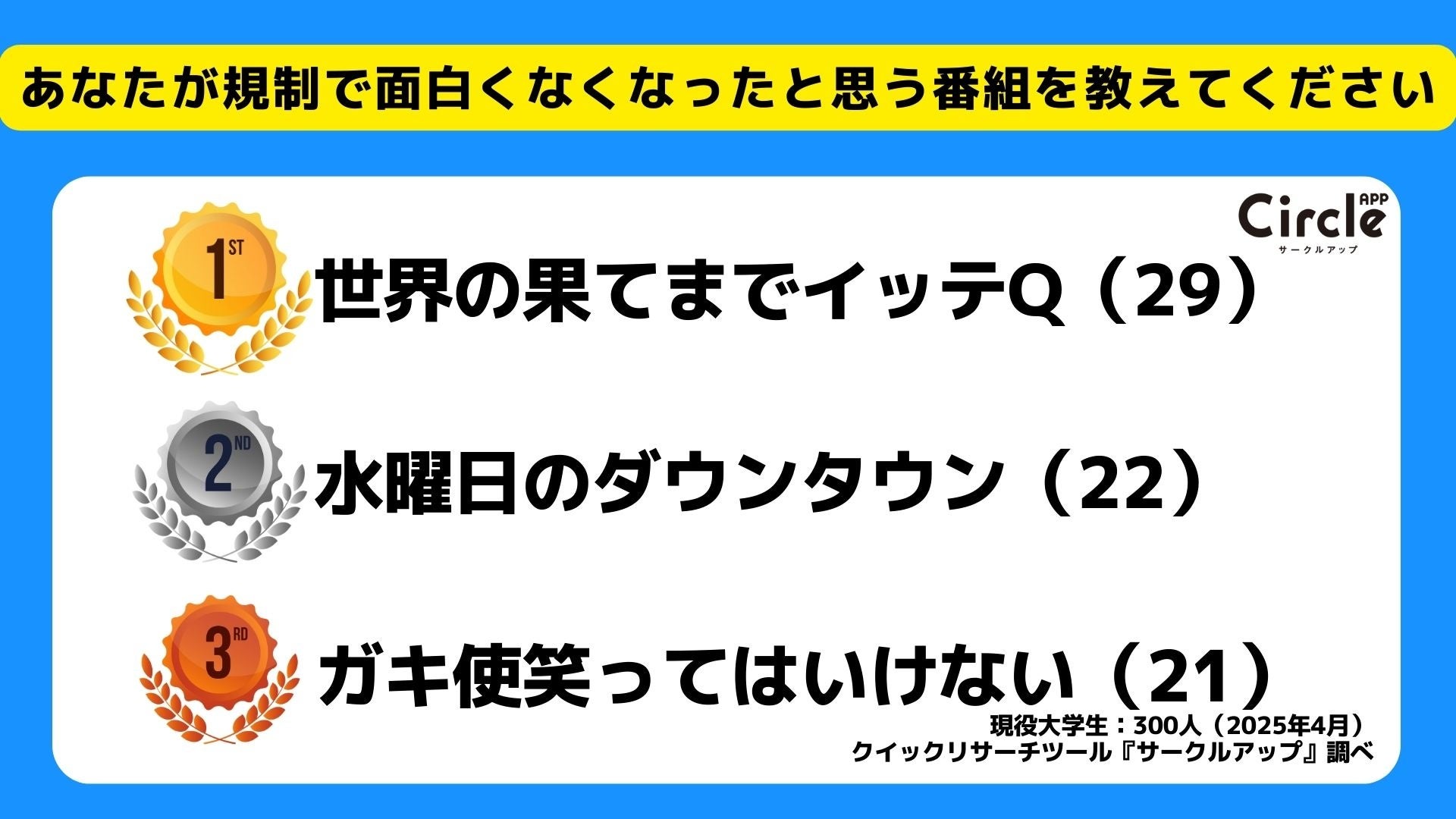 実際に規制で面白くなくなったと思う番組を質問したところ、「世界の果てまでイッテQ」(29票)、「水曜日のダウンタウン」(22票)、「ガキの使いやあらへんで笑ってはいけないシリーズ」(21票)が特に多くの票を集めました。
