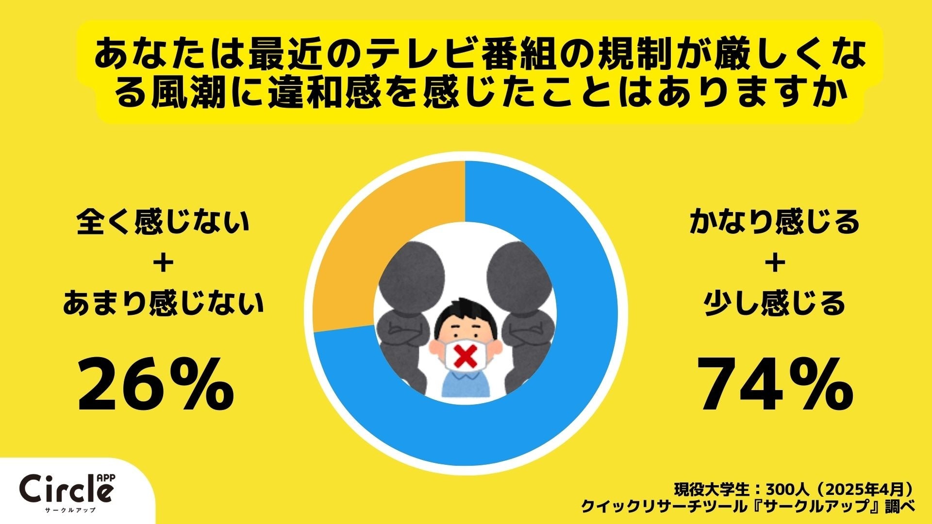 さらに、テレビ番組の表現規制が年々厳しくなっていることに関してアンケートを取ったところ7割以上が「違和感を感じる」といった結果になり、テレビの規制と若者がテレビに求めるものにギャップがあることが明らかになりました。