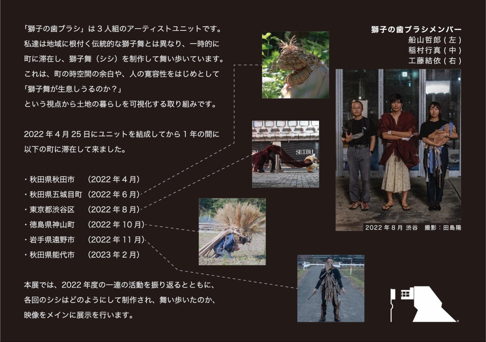 獅子の歯ブラシの概要 3人組の獅子舞ユニットは「獅子の歯ブラシ」と名乗っています。獅子にとって最も重要な行為は「噛む(bite)」ことで土地に宿る厄を祓うことです。見方を変えれば、噛むための ”歯”と噛むべき ”厄”がなければ、獅子は生息できません。獅子舞の生息可能性を探る一連の活動は、獅子に欠かすことのできない ”歯”を磨く行為と等しく捉えることができるのではないでしょうか。