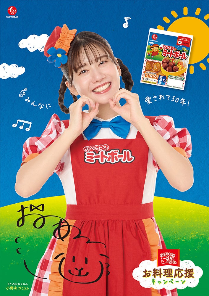 1974年に発売し、今年で50周年をむかえる『イシイのミートボール』は、みなさまの悩みにこたえる商品として、多くのお弁当やお料理シーンにご利用いただいてきました。石井食品は、「これからも、みなさんの味方になりたい!」、「お料理する時間が楽しくあってほしい!」という思いをこめて、小野あつこさん(うたのおねえさん)とともにみなさまを応援いたします!