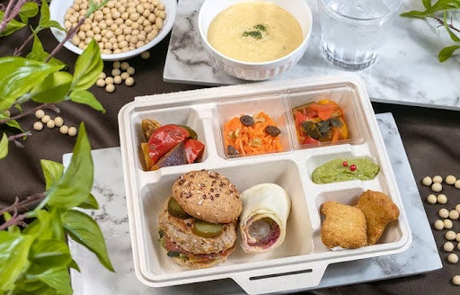 「大豆ミートバーガーボックス」に豆乳コーンクリームスープがついたプランです。濃厚で優しい味わいのスープです。
