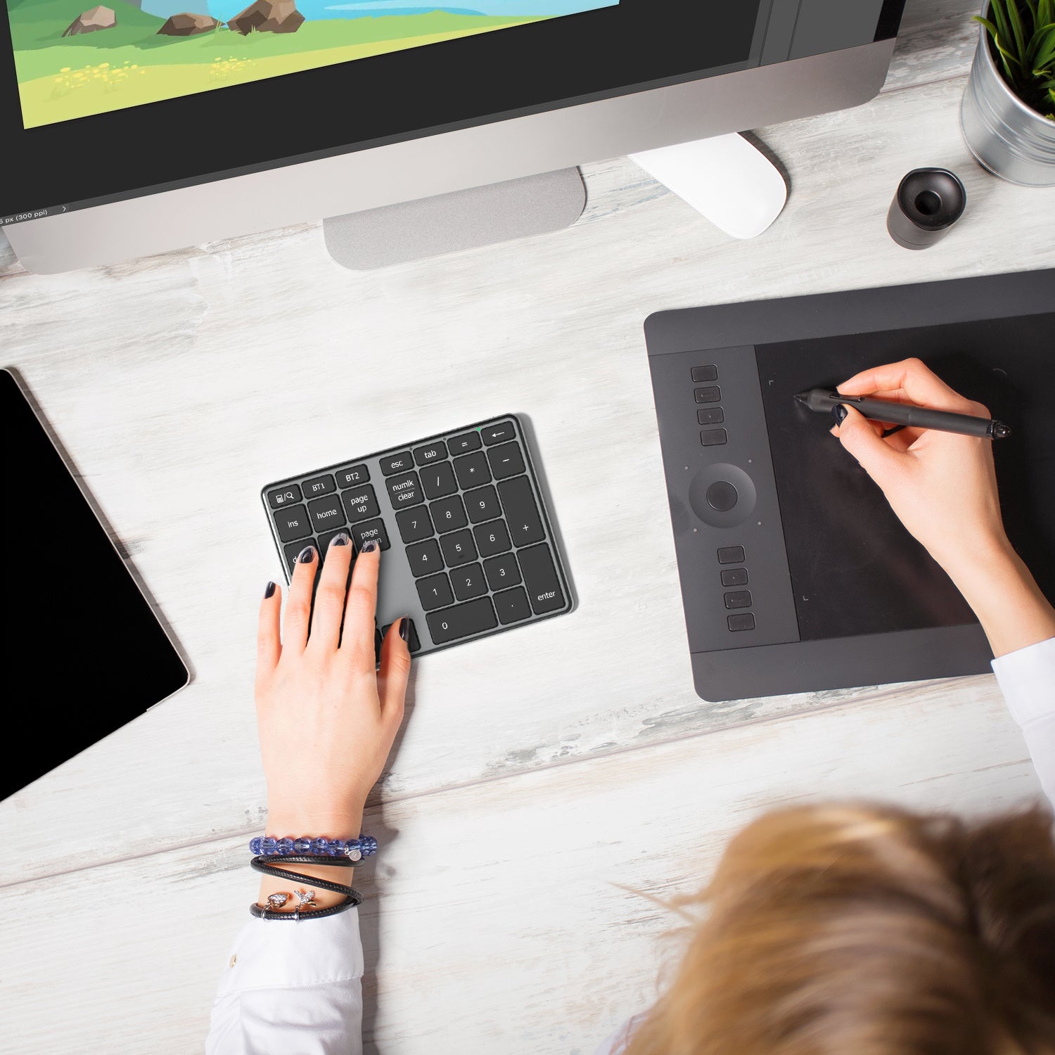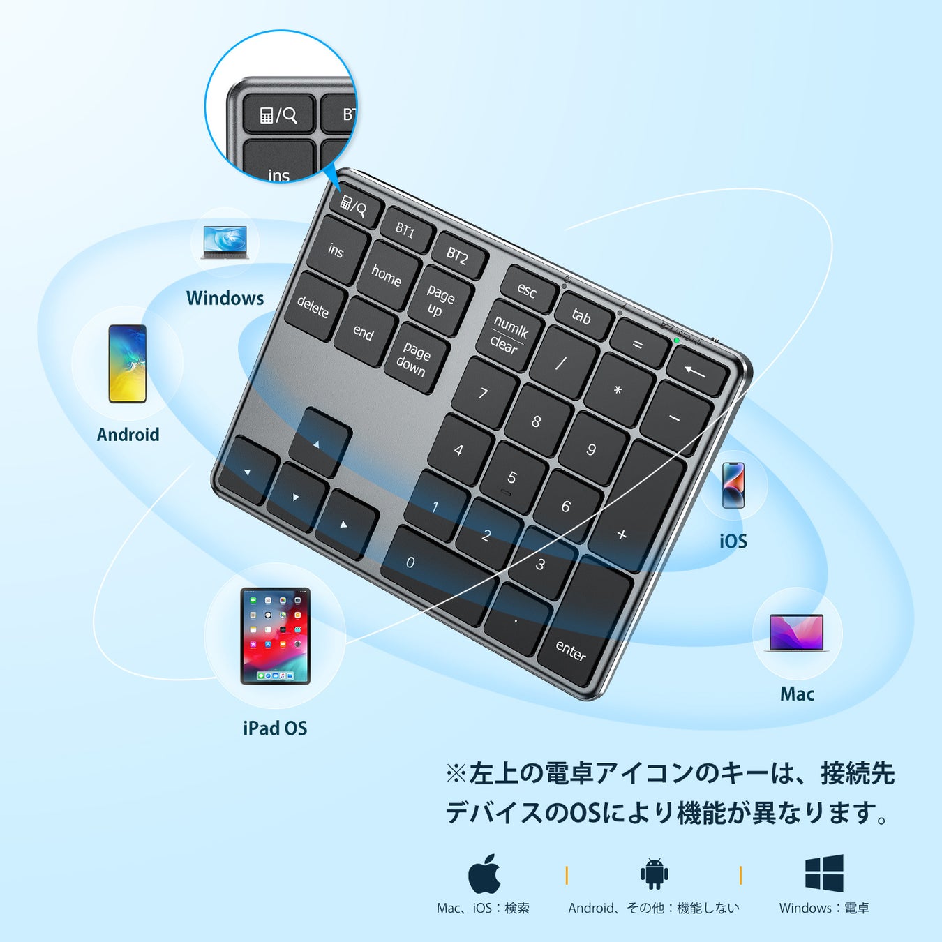 通常のテンキー配列に加えて、方向キーやpage up、page downキーを搭載しているiCleverオリジナル配列のBluetooth接続のテンキーです。片手で表計算を快適に行うことができるため作業効率が格段に上がります。また電卓マークのキーを押せばワンタッチで電卓を画面に表示し、テンキーが電卓に早変わりします(Mac、iOSの場合は検索機能)。