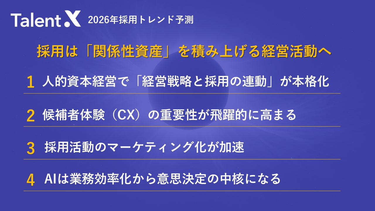「2025年は、多くの企業様にとって、これまでの採用のあり方を問い直す『大きな転換点』となった一年でした。従来のやり方が通じにくくなった現実は、決して悲観すべきことではなく、日本企業が『人を集める』から『人とつながり続ける』へと進化するための、ポジティブな兆しだと捉えています。採用を単なる欠員補充ではなく、経営における『資産形成』と捉え直す動きは、2026年以降、新しいスタンダードになっていくでしょう。2026年以降も、私たちTalentXは、この変化をテクノロジーで支え、日本企業の採用が『関係性資産』として積み上がる未来を、皆さまと共に切り拓いてまいります。」