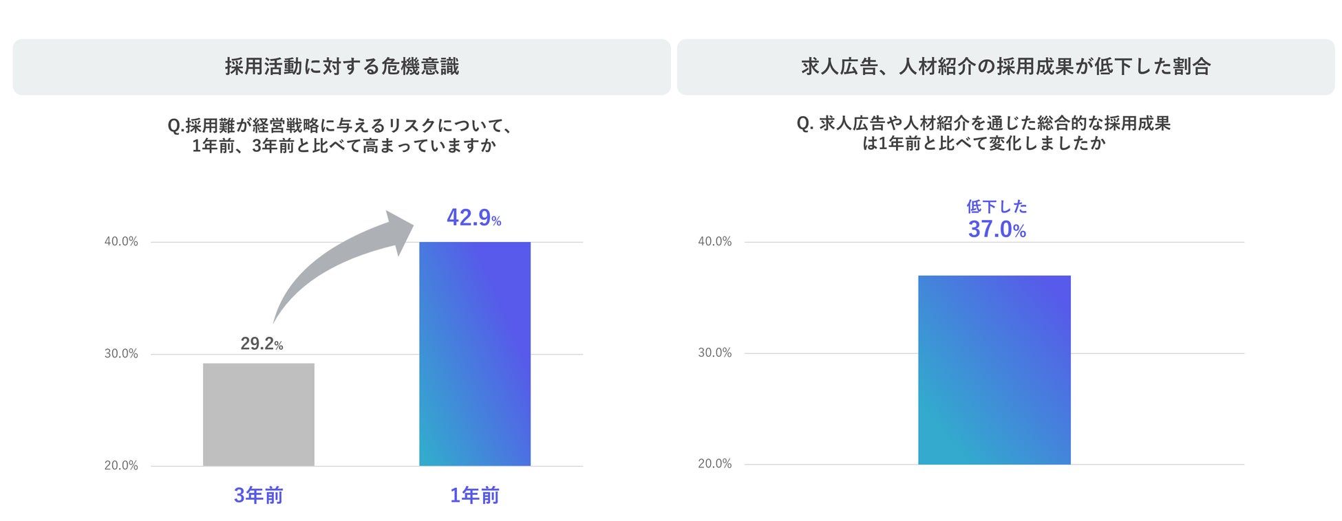 2025年の最も大きな変化は、採用難に対する危機感が経営と採用現場の共通認識として定着したことです。当社調査では採用難が経営戦略に与えるリスクについて、直近1年で「大幅に高まった」割合が42.9%を示しており、3年前から大きく上昇しました。また、求人広告や人材紹介を通じた採用成果は、直近1年で「低下した」と感じている企業が37.0%にのぼっています。リスクが高まっている一方、成果獲得が困難になっている実態が明らかになりました。