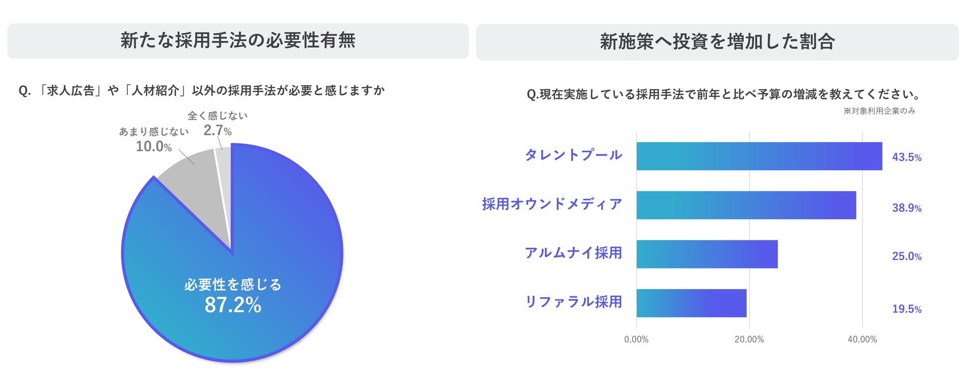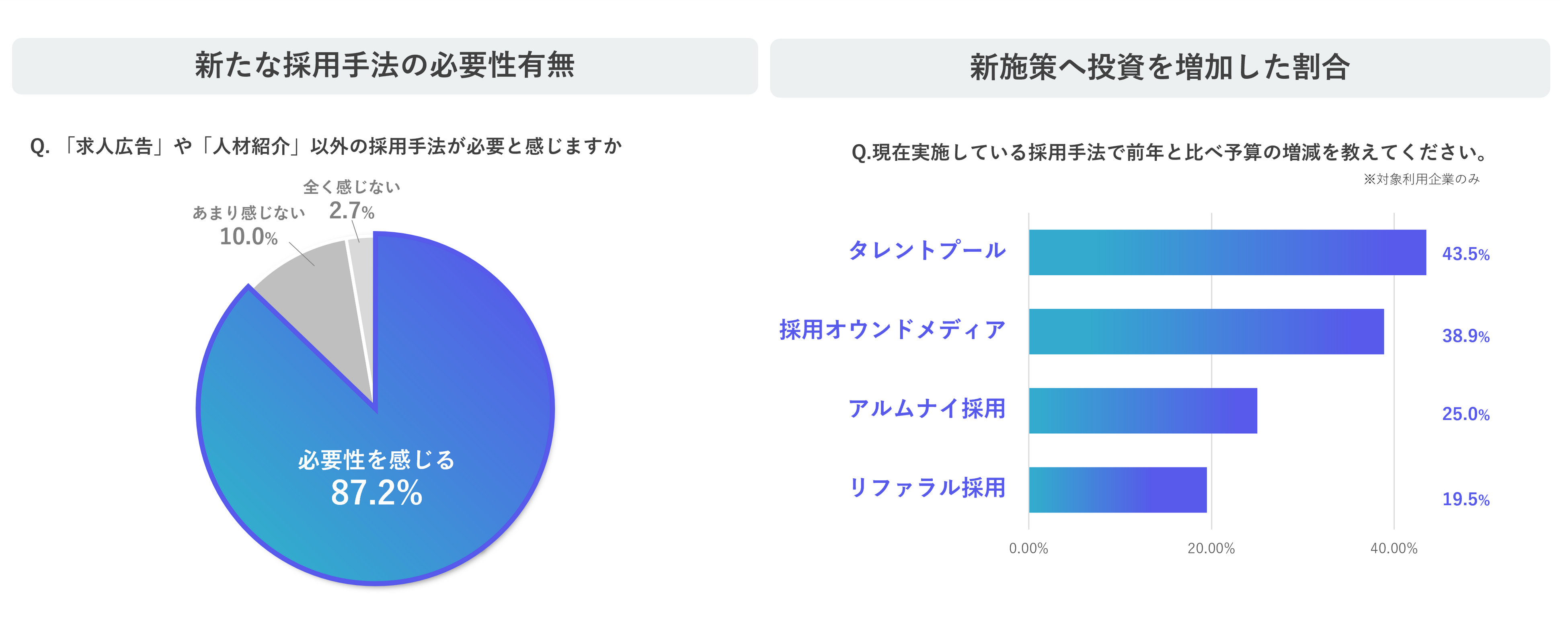 「求人広告・人材紹介以外の新たな採用手法が必要」と回答した企業は87.2%に達し、従来の採用手法による人材獲得の難易度は高まっています。その結果、リファラル採用(実施58.4%)、アルムナイ施策(実施42.0%)、過去応募者や辞退者へのアプローチを行うタレントプール施策(実施31.5%、検討含め63.0%)など、将来の候補者との関係性を前提とした取り組みが広がりを見せました。