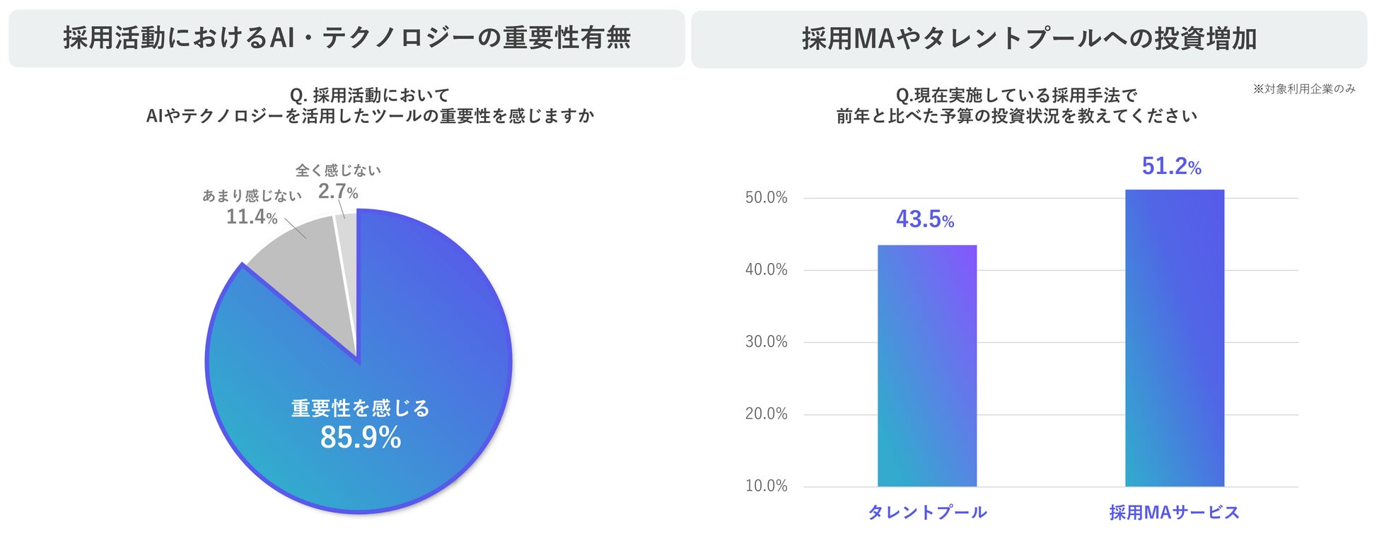 こうした背景のもと、採用を持続させるため、テクノロジーと仕組みに支えられる採用への変革が加速した一年でした。調査では、採用活動において「AIやテクノロジーの活用」が重要だと感じている担当者は85.9%にのぼりました。タレントプールの予算を「増加」と回答した企業は43.5%、採用MAサービスの予算を「増加」と回答した企業は51.2%と、候補者との継続的な関係構築を目的とした仕組みへの投資が進んでいます。AIやテクノロジーは、もはや一部の先進企業だけの最先端の選択肢ではなく、採用を持続させるための標準装備となりつつあります。