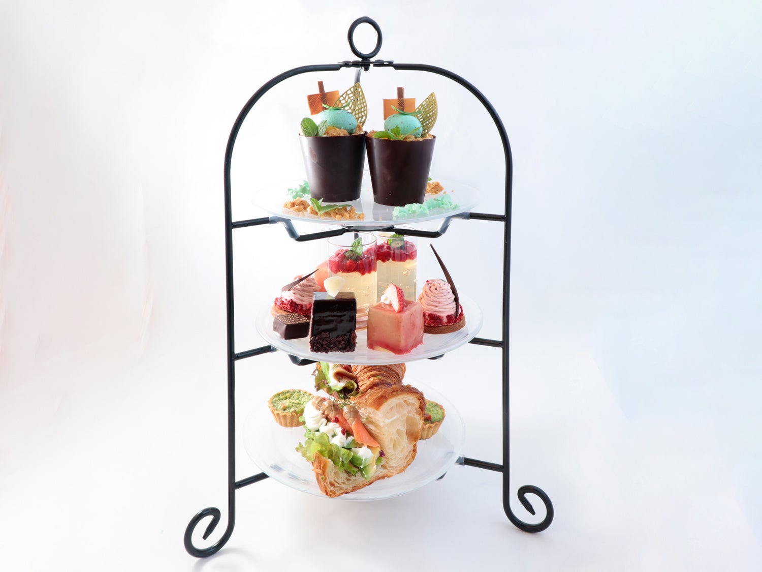中段には、ケーキやボンボンショコラ、下段には、サンドイッチとミニキッシュを盛り合わせました。
