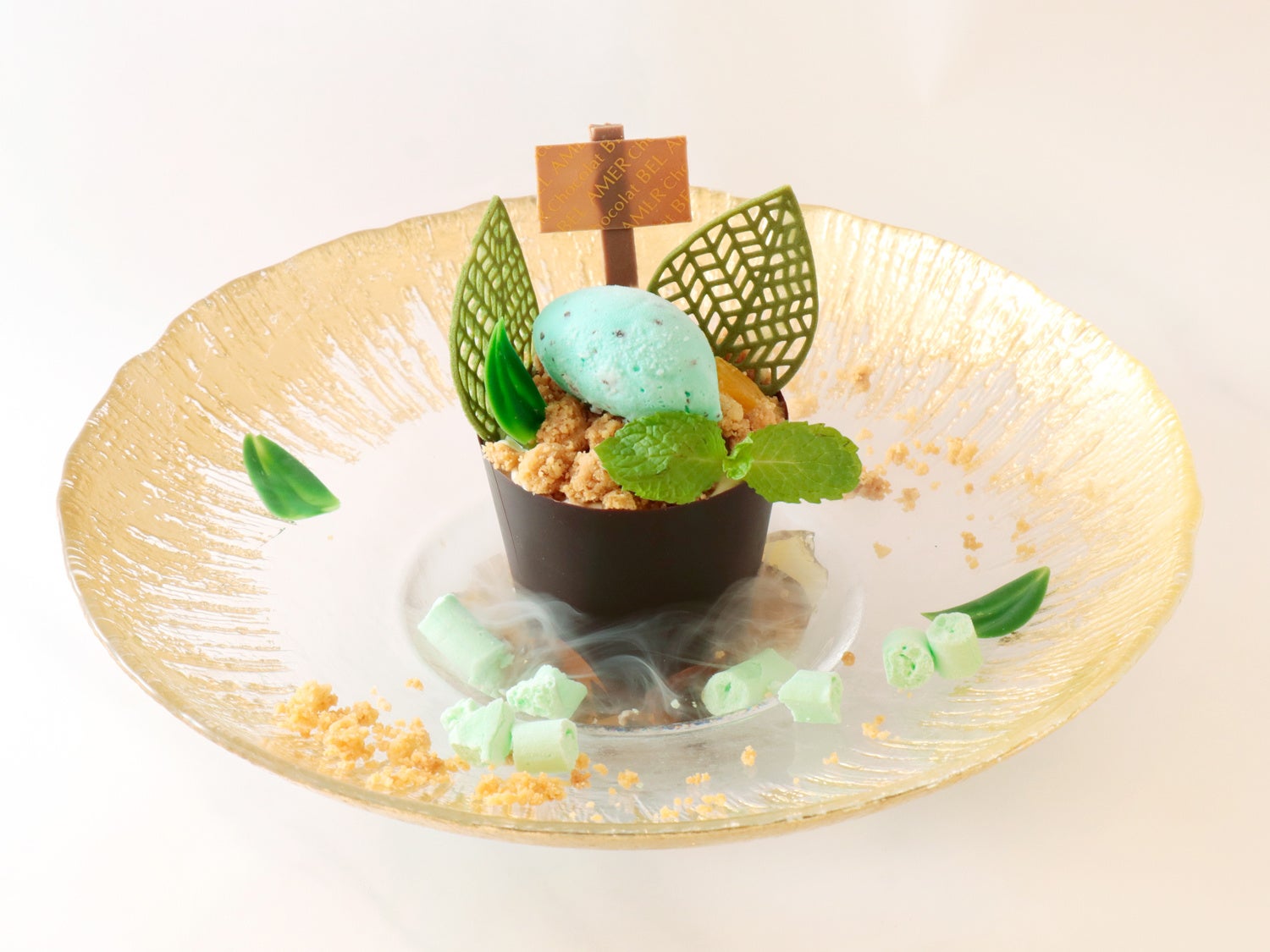 ビターチョコの植木鉢の中には、ミントのエスプーマやチョコアイスなどが入っており、楽しい一皿に。